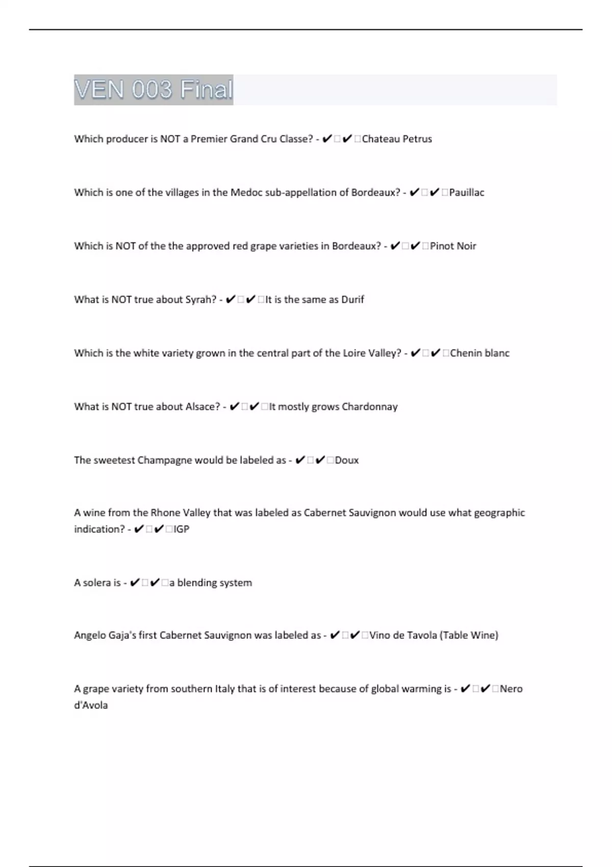 Which producer is NOT a Premier Grand Cru Classe? - ️️Chateau Petrus Which is one of the villages in the Medoc sub-appellation of Bordeaux? - ️️Pauillac Which is NOT of the the approved red grape varieties in Bordeaux? - ️️Pinot Noir What is NOT true about Syrah? - ️️It is the same as Durif Which is the white variety grown in the central part of the Loire Valley? - ️️Chenin blanc What is NOT true about Alsace? - ️️It mostly grows Chardonnay The sweetest Champagne would be labeled as - ️️Doux A wine from the Rhone Valley that was labeled as Cabernet Sauvignon would use what geographic indication? - ️️IGP A solera is - ️️a blending system Angelo Gaja's first Cabernet Sauvignon was labeled as - ️️Vino de Tavola (Table Wine) A grape variety from southern Italy that is of interest because of global warming is - ️️Nero d'Avola