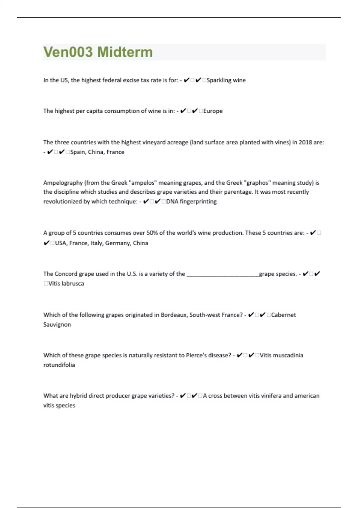 In the US, the highest federal excise tax rate is for: - ️️Sparkling wine The highest per capita consumption of wine is in: - ️️Europe The three countries with the highest vineyard acreage (land surface area planted with vines) in 2018 are: - ️️Spain, China, France Ampelography (from the Greek "ampelos" meaning grapes, and the Greek "graphos" meaning study) is the discipline which studies and describes grape varieties and their parentage. It was most recently revolutionized by which technique: - ️️DNA fingerprinting A group of 5 countries consumes over 50% of the world's wine production. These 5 countries are: - ️️USA, France, Italy, Germany, China The Concord grape used in the U.S. is a variety of the ______________________grape species. - ️️Vitis labrusca Which of the following grapes originated in Bordeaux, South-west France? - ️️Cabernet Sauvignon Which of these grape species is naturally resistant to Pierce's disease? - ️️Vitis muscadinia rotundifolia What are hybrid direct producer grape varieties? - ️️A cross between vitis vinifera and american vitis species