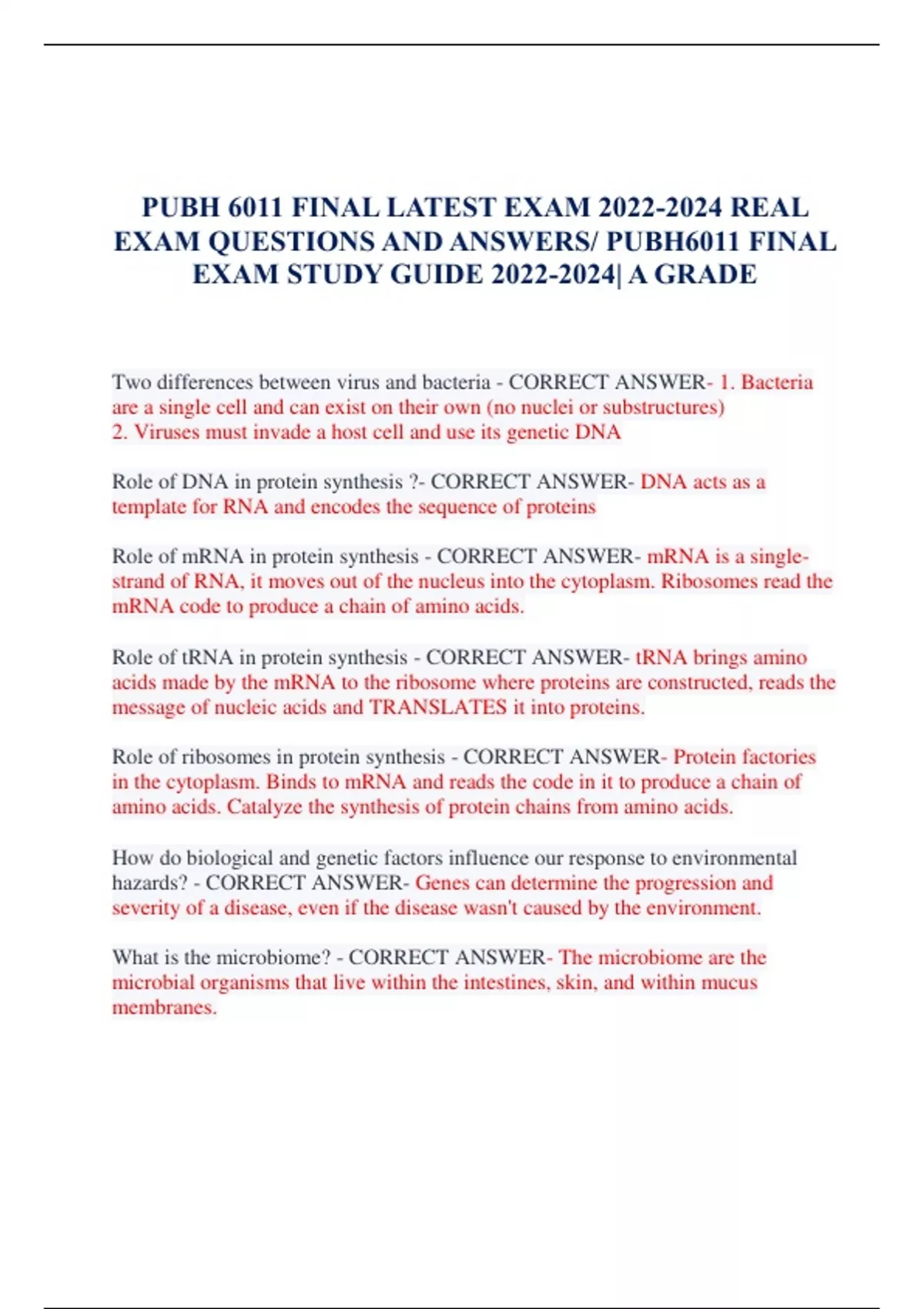PUBH 6011 FINAL LATEST EXAM REAL EXAM QUESTIONS AND ANSWERS/ PUBH6011 FINAL EXAM STUDY GUIDE | A GRADE Two differences between virus and bacteria - CORRECT ANSWER- 1. Bacteria are a single cell and can exist on their own (no nuclei or substructures) 2. Viruses must invade a host cell and use its genetic DNA Role of DNA in protein synthesis ?- CORRECT ANSWER- DNA acts as a template for RNA and encodes the sequence of proteins Role of mRNA in protein synthesis - CORRECT ANSWER- mRNA is a singlestrand of RNA, it moves out of the nucleus into the cytoplasm. Ribosomes read the mRNA code to produce a chain of amino acids. Role of tRNA in protein synthesis - CORRECT ANSWER- tRNA brings amino acids made by the mRNA to the ribosome where proteins are constructed, reads the message of nucleic acids and TRANSLATES it into proteins. Role of ribosomes in protein synthesis - CORRECT ANSWER- Protein factories in the cytoplasm. Binds to mRNA and reads the code in it to produce a chain of amino acids. Catalyze the synthesis of protein chains from amino acids. How do biological and genetic factors influence our response to environmental hazards? - CORRECT ANSWER- Genes can determine the progression and severity of a disease, even if the disease wasn't caused by the environment. What is the microbiome? - CORRECT ANSWER- The microbiome are the microbial organisms that live within the intestines, skin, and within mucus membranes. How does the microbiome prevent disease? - CORRECT ANSWER- The microbiome can impact how toxicants are absorbed (or not absorbed) into the body and impact our susceptibility to disease. Define: Environmental response gene - CORRECT ANSWER- This dictates a person's response to certain environmental exposures, but without exposure it has no health consequence. Explain how environmental factors influence genetic expression. - CORRECT ANSWER- Epigenetics - heritable changes in the phenotype without changes in the DNA structure (genotype). The environment can change what genes are expressed and when. Epigenetics determines which genes are expressed (turned on or off). Central Dogma of DNA to Protein - CORRECT ANSWER- DNA - Transcription - RNA - Translation - Protein Types of Genetic Mutations (two big categories) - CORRECT ANSWER- 1. Microlesions 2. Macrolesions Types of Microlesions (genetic mutations) - Two Types - CORRECT ANSWER1. Base-pair substitution 2. Frameshift Mutations Types of Macrolesions (genetic mutations) - Two Types - CORRECT ANSWER1. Chromosome Aberrations 2. Changes in chromosome number (aneuploidy, polyploidy) Explain base-pair substitution - CORRECT ANSWER- Changes the sequence of the genetic base pairs (AT/GC) due to an interaction with an outside chemical structure. Point mutations. Does not always change the function (but can) Explain frameshift mutations - CORRECT ANSWER- Insertion or deletion of one or more bases (AT/GC) in the sequence. Changes the reading frame. Almost always get an altered protein, often leads to non-functional. Explain Chromosome Aberrations - CORRECT ANSWER- Change in chromosome structure via deletion, duplication, inversion, translocation. Benzene, ionizing radiation can cause it. Explain changes in chromosome number (two types) - CORRECT ANSWER- 1. Aneuploidy - increase in number of one or more chromosomes (usually sperm/eggs). Odd number of chromosomes in gamete (trisomy/monosomy) 2. Polyploidy - increase in a whole set of chromosomes Name the 4 types of chromosomal aberrations (macrolesion) - CORRECT ANSWER- 1. Deletion 2. Translocation 3. Duplication 4. Inversion Define chromosomal deletion - CORRECT ANSWER- A chromosome segment is lost completely Define chromosomal translocation - CORRECT ANSWER- A segment from a chromosome is transferred to another one