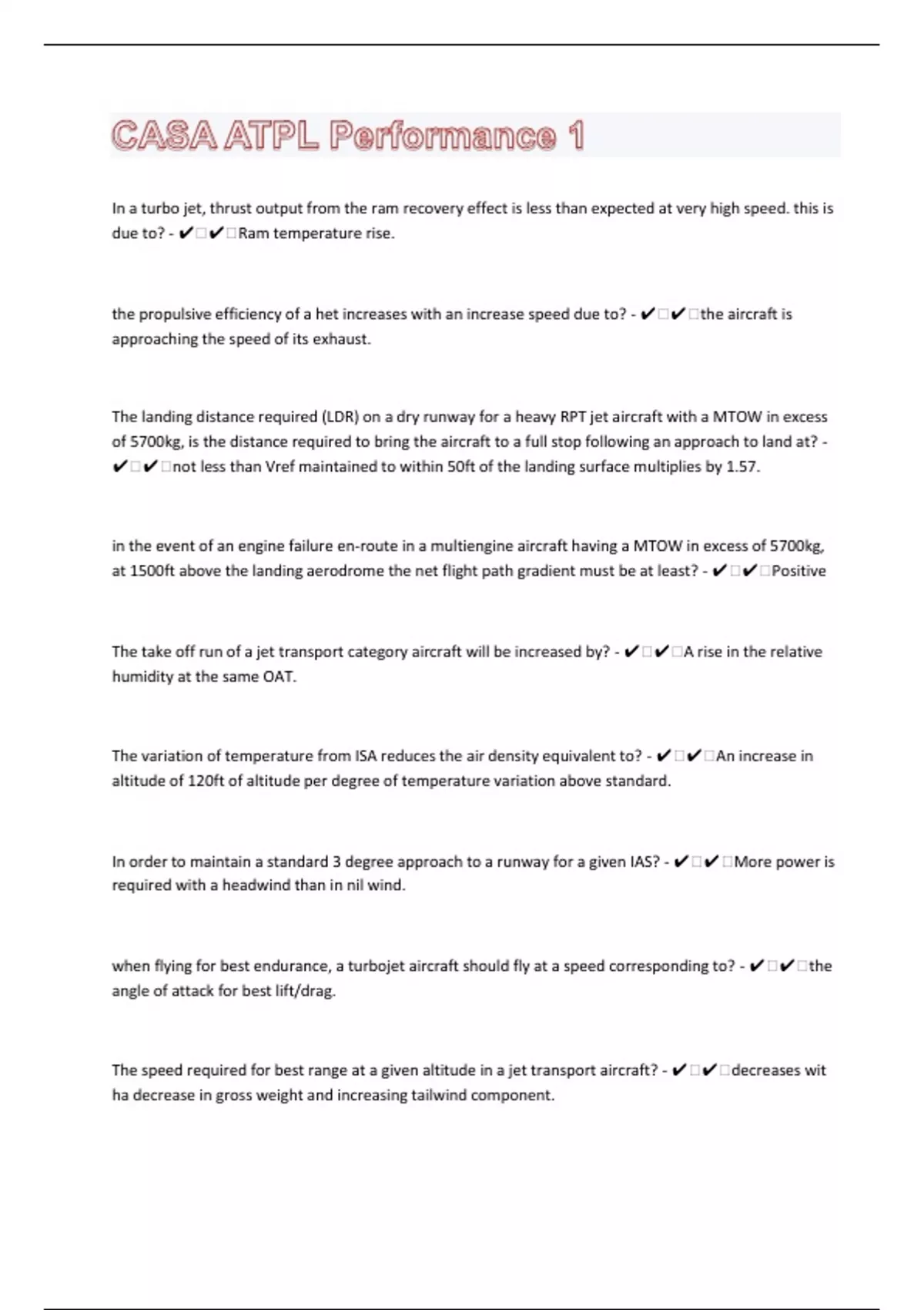 In a turbo jet, thrust output from the ram recovery effect is less than expected at very high speed. this is due to? - ️️Ram temperature rise. the propulsive efficiency of a het increases with an increase speed due to? - ️️the aircraft is approaching the speed of its exhaust. The landing distance required (LDR) on a dry runway for a heavy RPT jet aircraft with a MTOW in excess of 5700kg, is the distance required to bring the aircraft to a full stop following an approach to land at? - ️️not less than Vref maintained to within 50ft of the landing surface multiplies by 1.57. in the event of an engine failure en-route in a multiengine aircraft having a MTOW in excess of 5700kg, at 1500ft above the landing aerodrome the net flight path gradient must be at least? - ️️Positive The take off run of a jet transport category aircraft will be increased by? - ️️A rise in the relative humidity at the same OAT. The variation of temperature from ISA reduces the air density equivalent to? - ️️An increase in altitude of 120ft of altitude per degree of temperature variation above standard. In order to maintain a standard 3 degree approach to a runway for a given IAS? - ️️More power is required with a headwind than in nil wind. when flying for best endurance, a turbojet aircraft should fly at a speed corresponding to? - ️️the angle of attack for best lift/drag. The speed required for best range at a given altitude in a jet transport aircraft? - ️️decreases wit ha decrease in gross weight and increasing tailwind component.