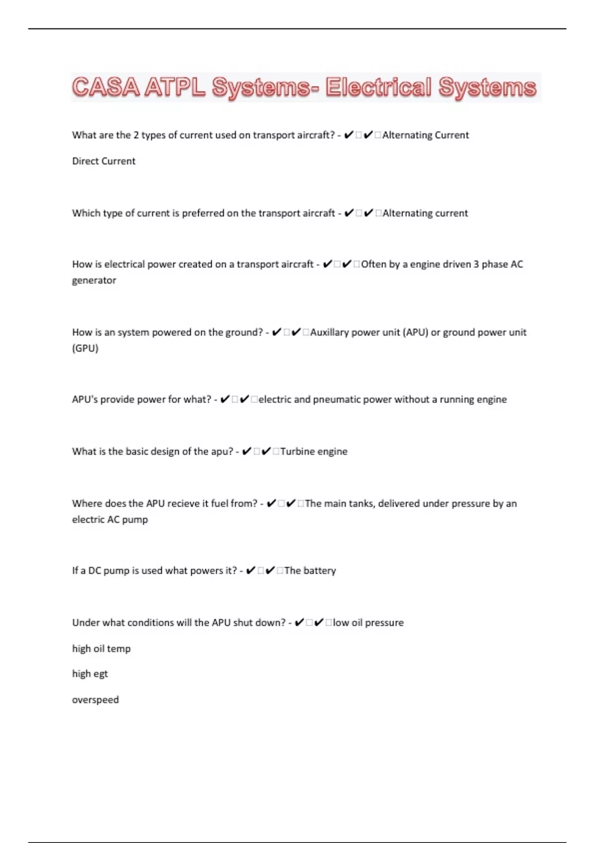 CASA ATPL Systems- Electrical Systems 54 Questions with 100% Correct Answers | Updated | Guaranteed A+