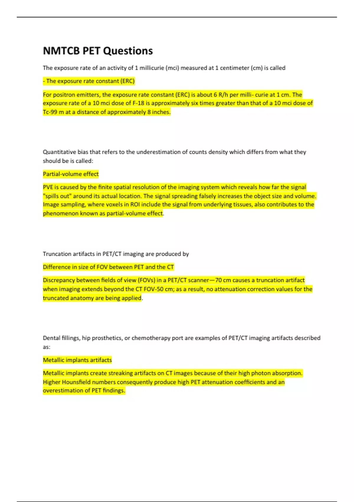 The exposure rate of an activity of 1 millicurie (mci) measured at 1 centimeter (cm) is called - The exposure rate constant (ERC) For positron emitters, the exposure rate constant (ERC) is about 6 R/h per milli- curie at 1 cm. The exposure rate of a 10 mci dose of F-18 is approximately six times greater than that of a 10 mci dose of Tc-99 m at a distance of approximately 8 inches. Quantitative bias that refers to the underestimation of counts density which differs from what they should be is called: Partial-volume effect PVE is caused by the finite spatial resolution of the imaging system which reveals how far the signal "spills out" around its actual location. The signal spreading falsely increases the object size and volume. Image sampling, where voxels in ROI include the signal from underlying tissues, also contributes to the phenomenon known as partial-volume effect. Truncation artifacts in PET/CT imaging are produced by Difference in size of FOV between PET and the CT Discrepancy between fields of view (FOVs) in a PET/CT scanner—70 cm causes a truncation artifact when imaging extends beyond the CT FOV-50 cm; as a result, no attenuation correction values for the truncated anatomy are being applied.
