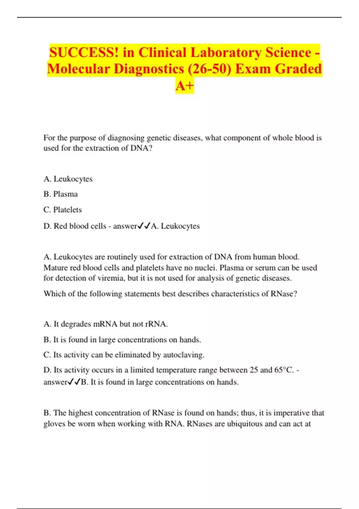 SUCCESS! in Clinical Laboratory Science - Molecular Diagnostics (26-50) Exam Graded A+ For the purpose of diagnosing genetic diseases, what component of whole blood is used for the extraction of DNA? A. Leukocytes B. Plasma C. Platelets D. Red blood cells - answerA. Leukocytes A. Leukocytes are routinely used for extraction of DNA from human blood. Mature red blood cells and platelets have no nuclei. Plasma or serum can be used for detection of viremia, but it is not used for analysis of genetic diseases. Which of the following statements best describes characteristics of RNase? A. It degrades mRNA but not rRNA. B. It is found in large concentrations on hands. C. Its activity can be eliminated by autoclaving. D. Its activity occurs in a limited temperature range between 25 and 65°C. - answerB. It is found in large concentrations on hands. B. The highest concentration of RNase is found on hands; thus, it is imperative that gloves be worn when working with RNA. RNases are ubiquitous and can act at temperatures below freezing (-20°C) and above boiling. For longterm storage, purified RNA is best stored at —70°C or below. RNases plague experiments in which RNA is used. Simple autoclaving does not eliminate RNase activity. To remove RNases, glassware must be pretreated with an RNase inhibitor, such as DEPC, followed by autoclaving; alternatively, baking glassware in a >250°C oven for 4 hours will destroy RNase. To prevent RNA degradation, isolation of RNA should be done using chaotropic agents (e.g., guanidine isothiocyanate) that inhibit RNase activity. When analyzing RNA in a gel, formaldehyde or other agents that denature RNases must be included in the gel. High-quality (i.e., undegraded) RNA will appear as a long smear with two or three distinct areas that correspond to the ribosomal RNA subunits: 28S (-4800 bases), 18S (-1800 bases), and 5.8S (-160 bases), whereas degraded RNA will appear as a smear at the bottom of the gel Which of the following is the least likely inhibitor of PCR? A. Heme B. Sodium heparin C. DEPC (diethylpyrocarbonate) D. EDTA (ethylenediaminetetraacetic acid) - answerD. EDTA (ethylenediaminetetraacetic a