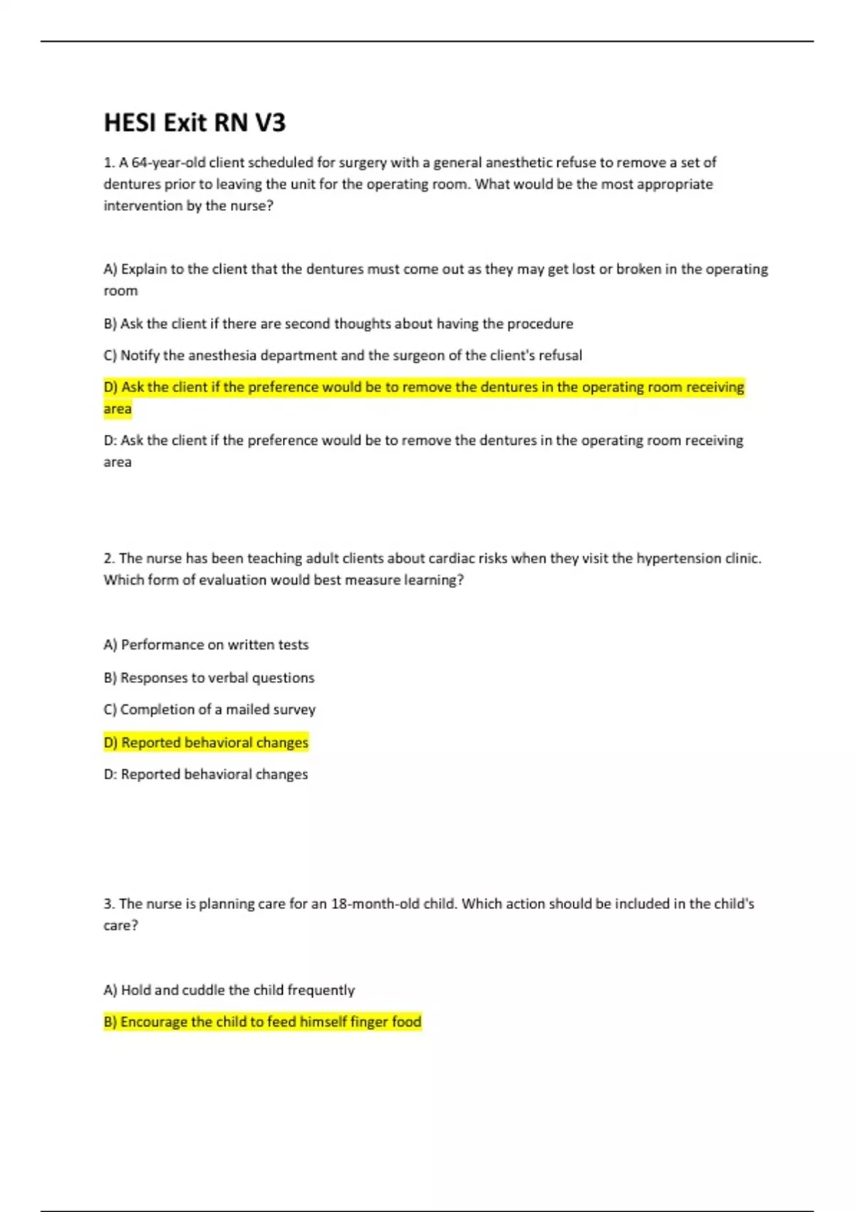 1. A 64-year-old client scheduled for surgery with a general anesthetic refuse to remove a set of dentures prior to leaving the unit for the operating room. What would be the most appropriate intervention by the nurse? A) Explain to the client that the dentures must come out as they may get lost or broken in the operating room B) Ask the client if there are second thoughts about having the procedure C) Notify the anesthesia department and the surgeon of the client's refusal D) Ask the client if the preference would be to remove the dentures in the operating room receiving area D: Ask the client if the preference would be to remove the dentures in the operating room receiving area 2. The nurse has been teaching adult clients about cardiac risks when they visit the hypertension clinic. Which form of evaluation would best measure learning? A) Performance on written tests B) Responses to verbal questions C) Completion of a mailed survey D) Reported behavioral changes D: Reported behavioral changes