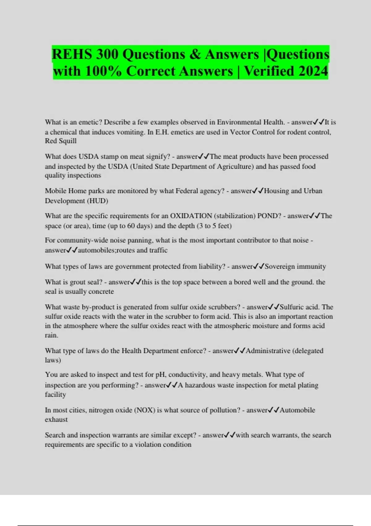 REHS 300 Questions & Answers |Questions with 100% Correct Answers | Verified 2024 What is an emetic? Describe a few examples observed in Environmental Health. - answerIt is a chemical that induces vomiting. In E.H. emetics are used in Vector Control for rodent control, Red Squill What does USDA stamp on meat signify? - answerThe meat products have been processed and inspected by the USDA (United State Department of Agriculture) and has passed food quality inspections Mobile Home parks are monitored by what Federal agency? - answerHousing and Urban Development (HUD) What are the specific requirements for an OXIDATION (stabilization) POND? - answerThe space (or area), time (up to 60 days) and the depth (3 to 5 feet) For community-wide noise panning, what is the most important contributor to that noise - answerautomobiles;routes and traffic What types of laws are government protected from liability? - answerSovereign immunity What is grout seal? - answerthis is the top space between a bored well and the ground. the seal is usually concrete What waste by-product is generated from sulfur oxide scrubbers? - answerSulfuric acid. The sulfur oxide reacts with the water in the scrubber to form acid. This is also an important reaction in the atmosphere where the sulfur oxides react with the atmospheric moisture and forms acid rain. What type of laws do the Health Department enforce? - answerAdministrative (delegated laws) You are asked to inspect and test for pH, conductivity, and heavy metals. What type of inspection are you performing? - answerA hazardous waste inspection for metal plating facility In most cities, nitrogen oxide (NOX) is what source of pollution? - answerAutomobile exhaust Search and inspection warrants are similar except? - answerwith search warrants, the search requirements are specific to a violation condition