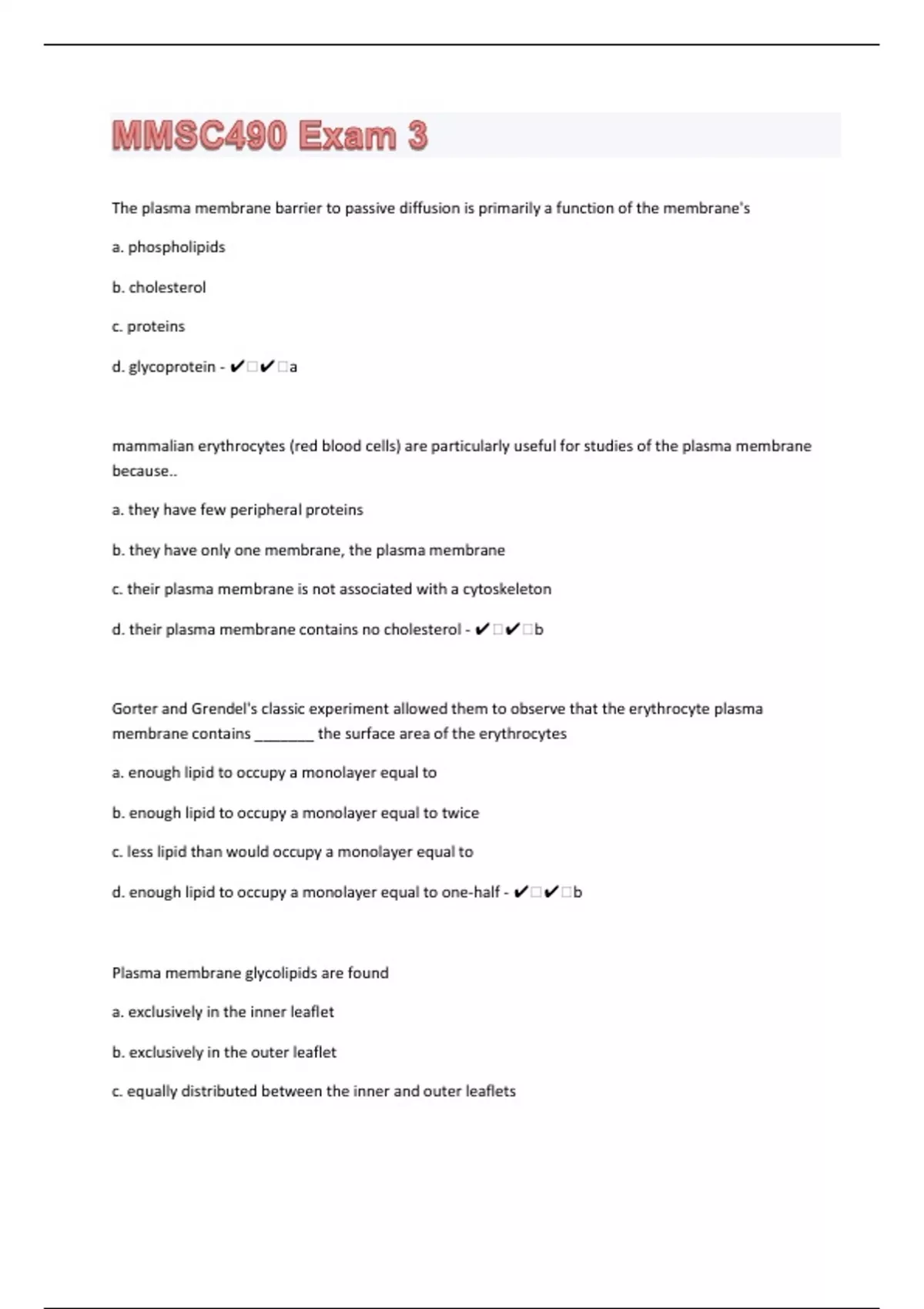 The plasma membrane barrier to passive diffusion is primarily a function of the membrane's a. phospholipids b. cholesterol c. proteins d. glycoprotein - ️️a mammalian erythrocytes (red blood cells) are particularly useful for studies of the plasma membrane because.. a. they have few peripheral proteins b. they have only one membrane, the plasma membrane c. their plasma membrane is not associated with a cytoskeleton d. their plasma membrane contains no cholesterol - ️️b Gorter and Grendel's classic experiment allowed them to observe that the erythrocyte plasma membrane contains _______ the surface area of the erythrocytes a. enough lipid to occupy a monolayer equal to b. enough lipid to occupy a monolayer equal to twice c. less lipid than would occupy a monolayer equal to d. enough lipid to occupy a monolayer equal to one-half - ️️b Plasma membrane glycolipids are found a. exclusively in the inner leaflet b. exclusively in the outer leaflet c. equally distributed between the inner and outer leaflets d. only on the basal surface of epithelia - ️️b