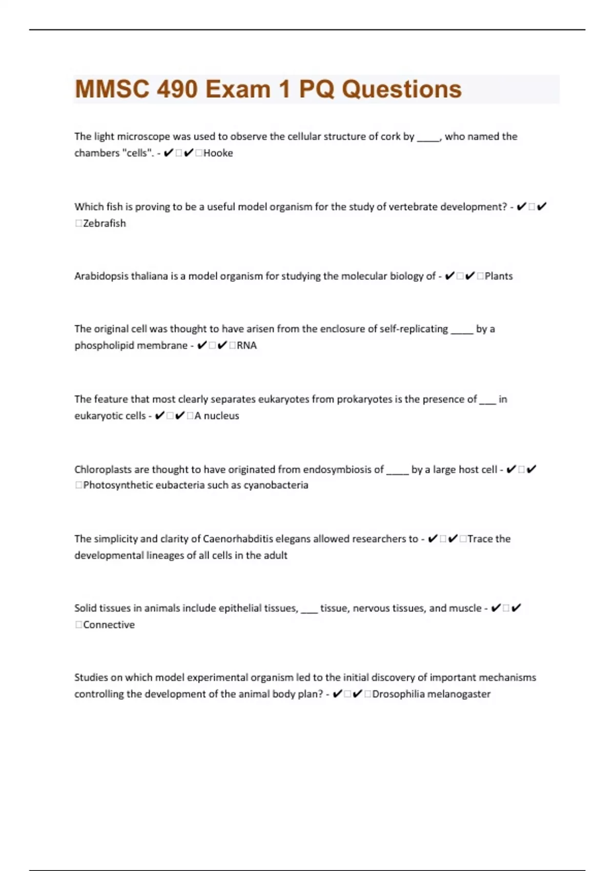 The light microscope was used to observe the cellular structure of cork by ____, who named the chambers "cells". - ️️Hooke Which fish is proving to be a useful model organism for the study of vertebrate development? - ️️Zebrafish Arabidopsis thaliana is a model organism for studying the molecular biology of - ️️Plants The original cell was thought to have arisen from the enclosure of self-replicating ____ by a phospholipid membrane - ️️RNA The feature that most clearly separates eukaryotes from prokaryotes is the presence of ___ in eukaryotic cells - ️️A nucleus Chloroplasts are thought to have originated from endosymbiosis of ____ by a large host cell - ️️Photosynthetic eubacteria such as cyanobacteria The simplicity and clarity of Caenorhabditis elegans allowed researchers to - ️️Trace the developmental lineages of all cells in the adult Solid tissues in animals include epithelial tissues, ___ tissue, nervous tissues, and muscle - ️️Connective Studies on which model experimental organism led to the initial discovery of important mechanisms controlling the development of the animal body plan? - ️️Drosophilia melanogaster