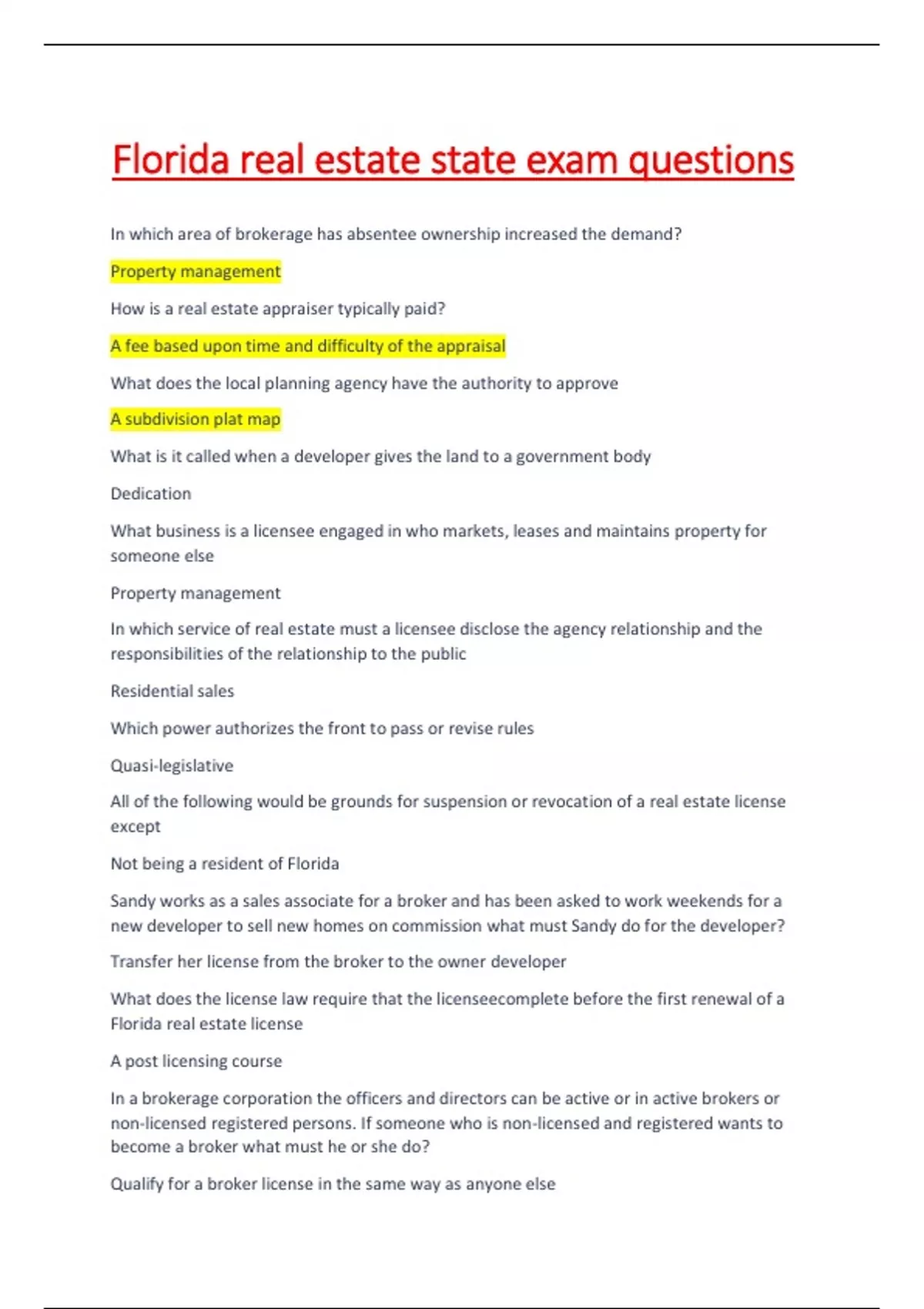 A subdivision plat map What is it called when a developer gives the land to a government body Dedication What business is a licensee engaged in who markets, leases and maintains property for someone else Property management In which service of real estate must a licensee disclose the agency relationship and the responsibilities of the relationship to the public Residential sales Which power authorizes the front to pass or revise rules Quasi-legislative All of the following would be grounds for suspension or revocation of a real estate license except Not being a resident of Florida Sandy works as a sales associate for a broker and has been asked to work weekends for a new developer to sell new homes on commission what must Sandy do for the developer? Transfer her license from the broker to the owner developer What does the license law require that the licenseecomplete before the first renewal of a Florida real estate license A post licensing course In a brokerage corporation the officers and directors can be active or in active brokers or non-licensed registered persons. If someone who is non-licensed and registered wants to become a broker what must he or she do? Qualify for a broker license in the same way as anyone else