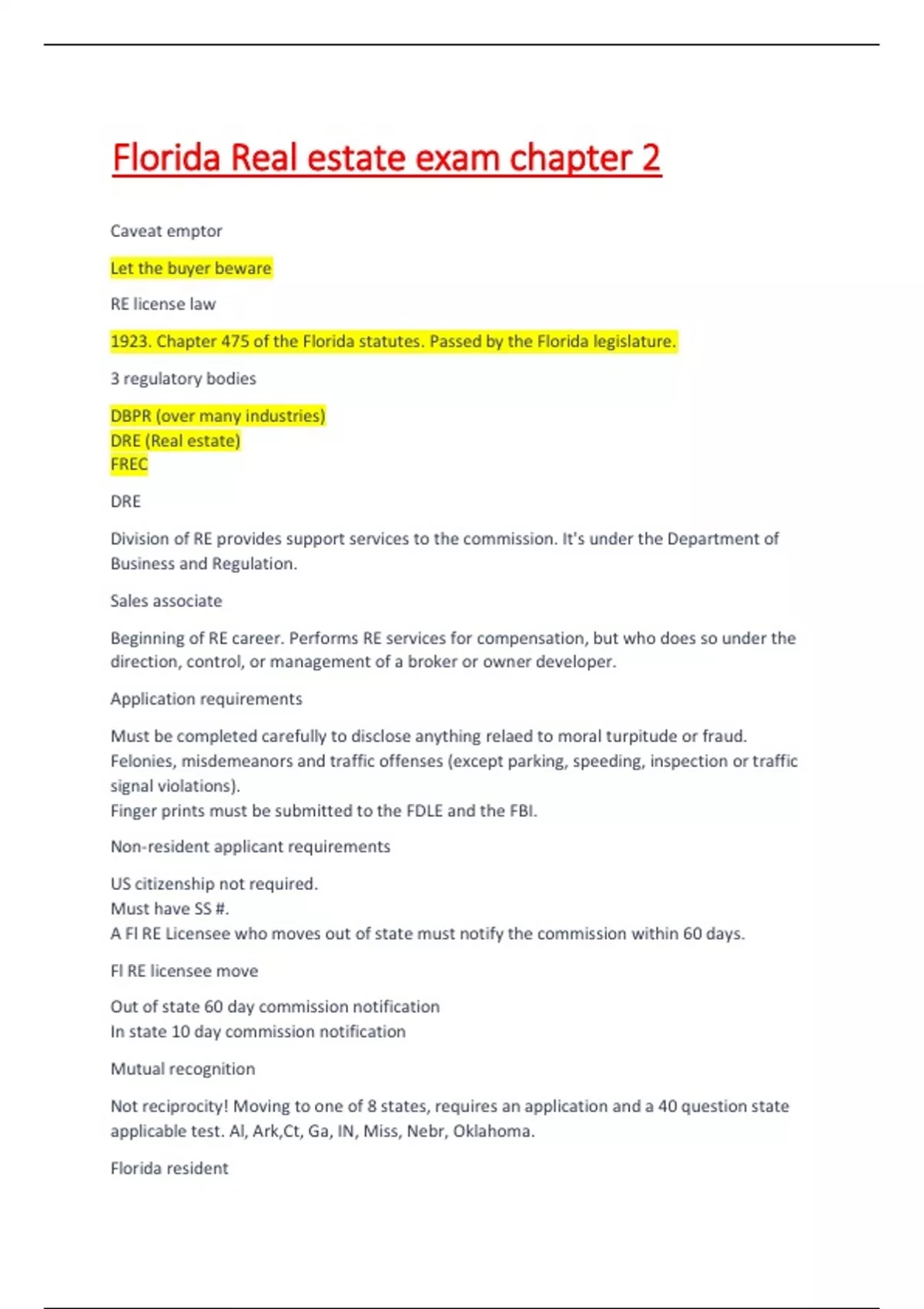 DRE Division of RE provides support services to the commission. It's under the Department of Business and Regulation. Sales associate Beginning of RE career. Performs RE services for compensation, but who does so under the direction, control, or management of a broker or owner developer. Application requirements Must be completed carefully to disclose anything relaed to moral turpitude or fraud. Felonies, misdemeanors and traffic offenses (except parking, speeding, inspection or traffic signal violations). Finger prints must be submitted to the FDLE and the FBI. Non-resident applicant requirements US citizenship not required. Must have SS #. A Fl RE Licensee who moves out of state must notify the commission within 60 days. Fl RE licensee move Out of state 60 day commission notification In state 10 day commission notification Mutual recognition Not reciprocity! Moving to one of 8 states, requires an application and a 40 question state applicable test. Al, Ark,Ct, Ga, IN, Miss, Nebr, Oklahoma. Florida resident