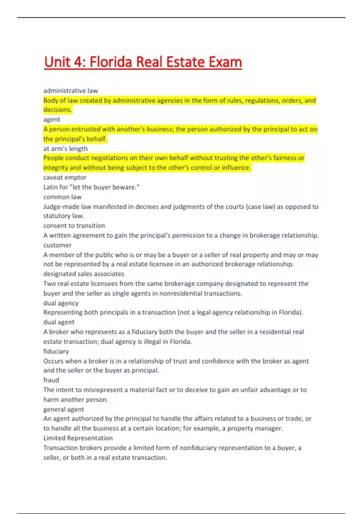 People conduct negotiations on their own behalf without trusting the other's fairness or integrity and without being subject to the other's control or influence. caveat emptor Latin for "let the buyer beware." common law Judge-made law manifested in decrees and judgments of the courts (case law) as opposed to statutory law. consent to transition A written agreement to gain the principal's permission to a change in brokerage relationship. customer A member of the public who is or may be a buyer or a seller of real property and may or may not be represented by a real estate licensee in an authorized brokerage relationship. designated sales associates Two real estate licensees from the same brokerage company designated to represent the buyer and the seller as single agents in nonresidential transactions. dual agency Representing both principals in a transaction (not a legal agency relationship in Florida). dual agent A broker who represents as a fiduciary both the buyer and the seller in a residential real estate transaction; dual agency is illegal in Florida. fiduciary Occurs when a broker is in a relationship of trust and confidence with the broker as agent and the seller or the buyer as principal. fraud The intent to misrepresent a material fact or to deceive to gain an unfair advantage or to harm another person. general agent An agent authorized by the principal to handle the affairs related to a business or trade, or to handle all the business at a certain location; for example, a property manager. Limited Representation Transaction brokers provide a limited form of nonfiduciary representation to a buyer, a seller, or both in a real estate transaction.