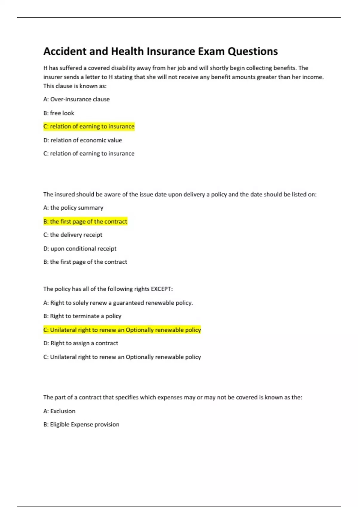 H has suffered a covered disability away from her job and will shortly begin collecting benefits. The insurer sends a letter to H stating that she will not receive any benefit amounts greater than her income. This clause is known as: A: Over-insurance clause B: free look C: relation of earning to insurance D: relation of economic value C: relation of earning to insurance The insured should be aware of the issue date upon delivery a policy and the date should be listed on: A: the policy summary B: the first page of the contract C: the delivery receipt D: upon conditional receipt B: the first page of the contract