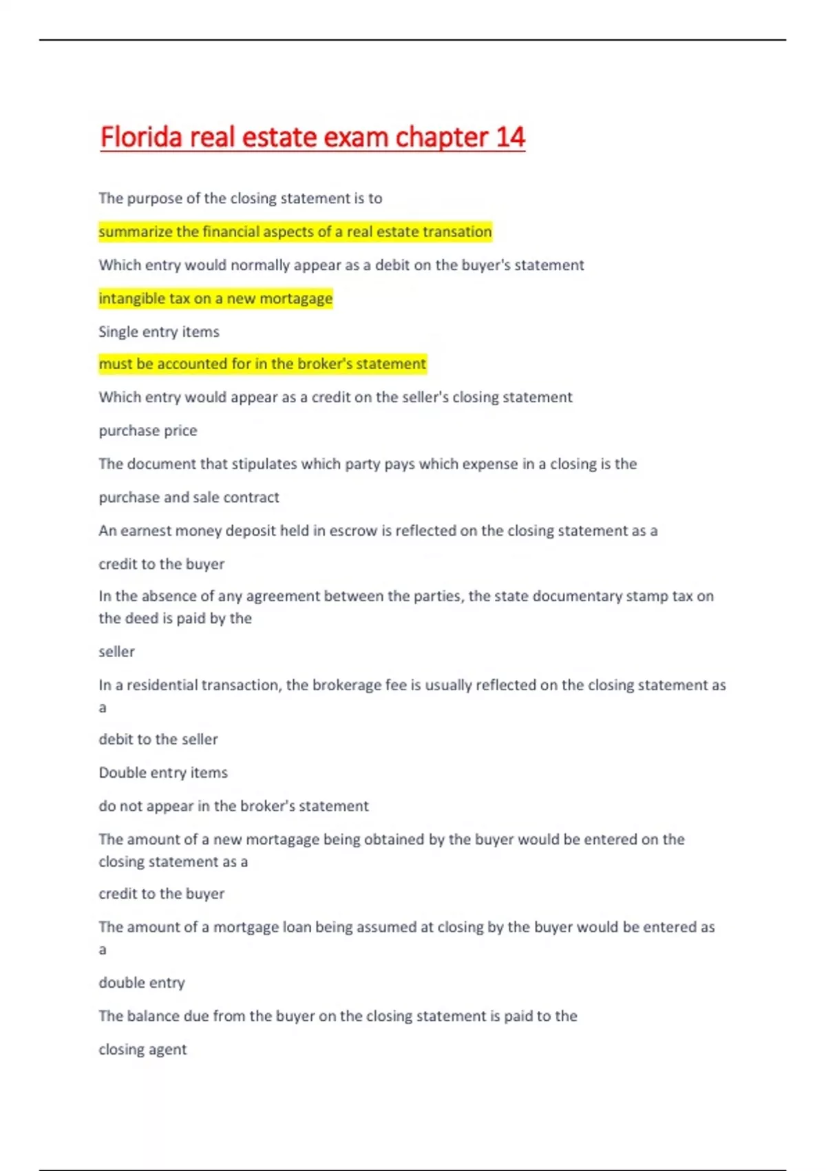 Single entry items must be accounted for in the broker's statement Which entry would appear as a credit on the seller's closing statement purchase price The document that stipulates which party pays which expense in a closing is the purchase and sale contract An earnest money deposit held in escrow is reflected on the closing statement as a credit to the buyer In the absence of any agreement between the parties, the state documentary stamp tax on the deed is paid by the seller In a residential transaction, the brokerage fee is usually reflected on the closing statement as a debit to the seller Double entry items do not appear in the broker's statement The amount of a new mortagage being obtained by the buyer would be entered on the closing statement as a credit to the buyer The amount of a mortgage loan being assumed at closing by the buyer would be entered as a double entry The balance due from the buyer on the closing statement is paid to the closing agen