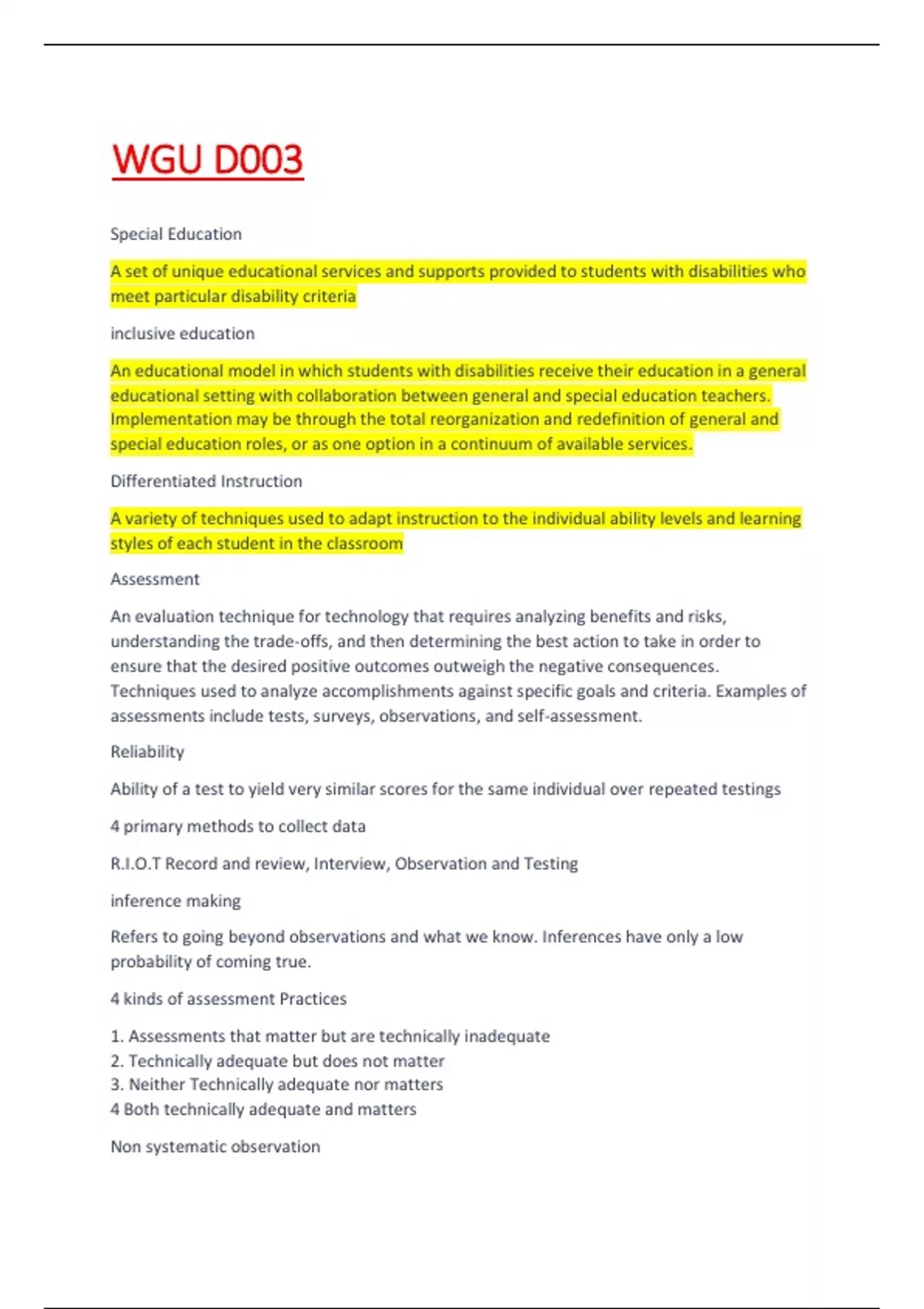 An educational model in which students with disabilities receive their education in a general educational setting with collaboration between general and special education teachers. Implementation may be through the total reorganization and redefinition of general and special education roles, or as one option in a continuum of available services. Differentiated Instruction A variety of techniques used to adapt instruction to the individual ability levels and learning styles of each student in the classroom Assessment An evaluation technique for technology that requires analyzing benefits and risks, understanding the trade-offs, and then determining the best action to take in order to ensure that the desired positive outcomes outweigh the negative consequences. Techniques used to analyze accomplishments against specific goals and criteria. Examples of assessments include tests, surveys, observations, and self-assessment. Reliability Ability of a test to yield very similar scores for the same individual over repeated testings 4 primary methods to collect data R.I.O.T Record and review, Interview, Observation and Testing inference making Refers to going beyond observations and what we know. Inferences have only a low probability of coming true. 4 kinds of assessment Practices 1. Assessments that matter but are technically inadequate 2. Technically adequate but does not matter 3. Neither Technically adequate nor matters 4 Both technically adequate and matters Non systematic observation