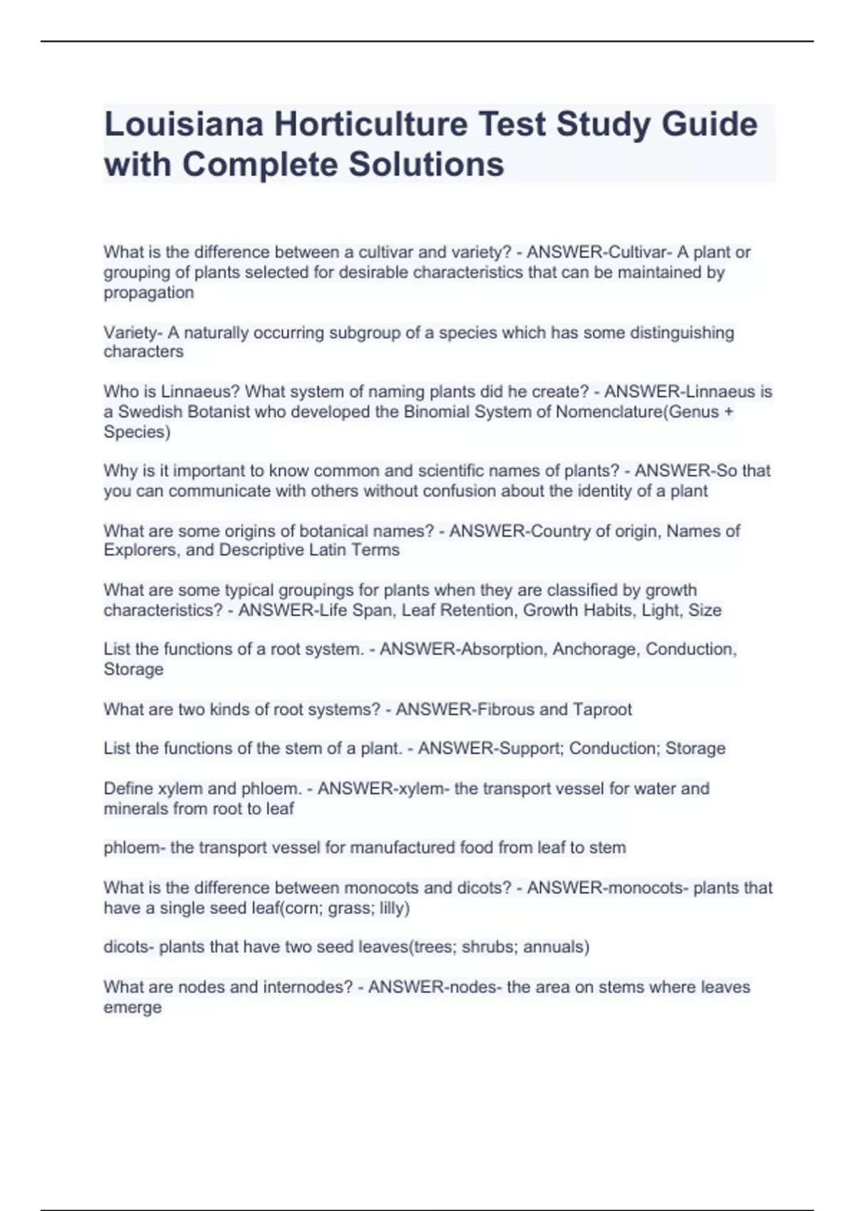 Louisiana Horticulture Test Study Guide with Complete SolutionsLouisiana Horticulture Test Study Guide with Complete SolutionsLouisiana Horticulture Test Study Guide with Complete Solutions Variety- A naturally occurring subgroup of a species which has some distinguishing characters