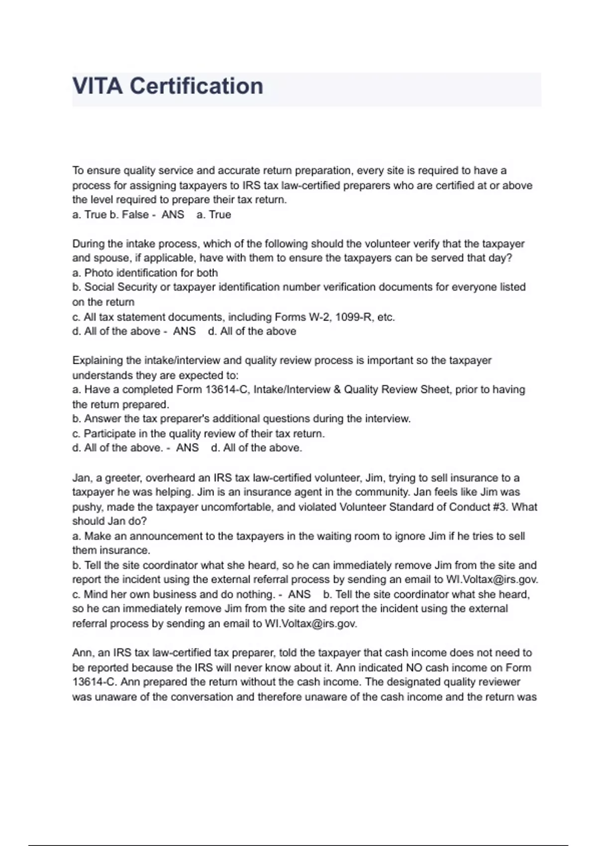 VITA Certification Exam Questions And Answers To ensure quality service and accurate return preparation, every site is required to have a process for assigning taxpayers to IRS tax law-certified preparers who are certified at or above the level required to prepare their tax return. a. True b. False - ANS a. True During the intake process, which of the following should the volunteer verify that the taxpayer and spouse, if applicable, have with them to ensure the taxpayers can be served that day? a. Photo identification for both b. Social Security or taxpayer identification number verification documents for everyone listed on the return c. All tax statement documents, including Forms W-2, 1099-R, etc. d. All of the above - ANS d. All of the above Explaining the intake/interview and quality review process is important so the taxpayer understands they are expected to: a. Have a completed Form 13614-C, Intake/Interview & Quality Review Sheet, prior to having the return prepared. b. Answer the tax preparer's additional questions during the interview. c. Participate in the quality review of their tax return. d. All of the above. - ANS d. All of the above. Jan, a greeter, overheard an IRS tax law-certified volunteer, Jim, trying to sell insurance to a taxpayer he was helping. Jim is an insurance agent in the community. Jan feels like Jim was pushy, made the taxpayer uncomfortable, and violated Volunteer Standard of Conduct #3. What should Jan do? a. Make an announcement to the taxpayers in the waiting room to ignore Jim if he tries to sell them insurance. b. Tell the site coordinator what she heard, so he can immediately remove Jim from the site and report the incident using the external referral process by sending an email to . c. Mind her own business and do nothing. - ANS b. Tell the site coordinator what she heard, so he can immediately remove Jim from the site and report the incident using the external referral process by sending an email to . Ann, an IRS tax law-certified tax preparer, told the taxpayer that cash income does not need to be reported because the IRS will never know about it. Ann indicated NO cash income on Form 13614-C. Ann prepared the return without the cash income. The designated quality reviewer was unaware of the conversation and therefore unaware of the cash income and the return was printed, signed, and e-filed. Did the designated quality reviewer violate the Volunteer Standards of Conduct? a. Yes b. No - ANS b. No Pat is a paid tax preparer in the community; he also gives back to the community by serving as an IRS tax law-certified volunteer tax preparer at a VITA/TCE site. While conducting the interview with the taxpayer, Pat discovers the taxpayer's small business will generate a loss, making the return out of scope for the VITA/ TCE Programs. Pat explains to the taxpayer that the tax return cannot be prepared at the VITA/TCE site, but he will offer the taxpayer a discount at his paid tax preparation business down the road. Has Pat violated the Volunteer Standards of Conduct (VSC)? a. Yes, it is a violation of the VSC for Pat to solicit business from any taxpayer at the VITA/TCE site. b. No, it is not a violation since the return cannot be prepared at the site. c. No, none of the VSC addresses soliciting business while volunteering at the VITA/TCE site. - ANS a. Yes, it is a violation of the VSC for Pat to solicit business from any taxpayer at the VITA/TCE site. Maggie wants her tax refund quickly; however, she doesn't have a bank account for direct deposit. She asks Josh, the tax law-certified preparer, to deposit her refund into his checking account and turn the funds over to her when received. If Josh agrees to do this, has he violated any of the Volunteer Standards of Conduct? a. Yes b. No - ANS a. Yes Is having a donation/tip jar at the quality review station within the VITA/TCE site a violation of the Volunteer Standards of Conduct? a. Yes b. No - ANS a. Yes Failure of a VITA/TCE volunteer to comply with the Volunteer Standards of Conduct could result in which of the following? a. The volunteer's removal from the VITA/TCE Programs. b. Inclusion in the IRS Volunteer Registry to bar future VITA/TCE activity indefinitely. c. Termination of the sponsoring organization partnership with the IRS. d. All of the above may be considered an appropriate action depending on the type of violation and the sponsoring partner's corrective actions. - ANS d. All of the above may be considered an appropriate action depending on the type of violation and the sponsoring partner's corrective actions. Which volunteers must pass the Volunteer Standards of Conduct (VSC) certifica- tion test? a. Site coordinators/local coordinators b. Quality reviewers and tax return preparers c. Greeters or client facilitators d. All VITA/TCE site volunteers must pass the VSC certification test - ANS d. All VITA/TCE site volunteers must pass the VSC certification test