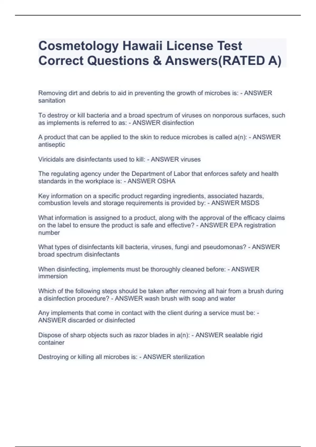 Cosmetology Hawaii License Test Correct Questions & Answers(RATED A)