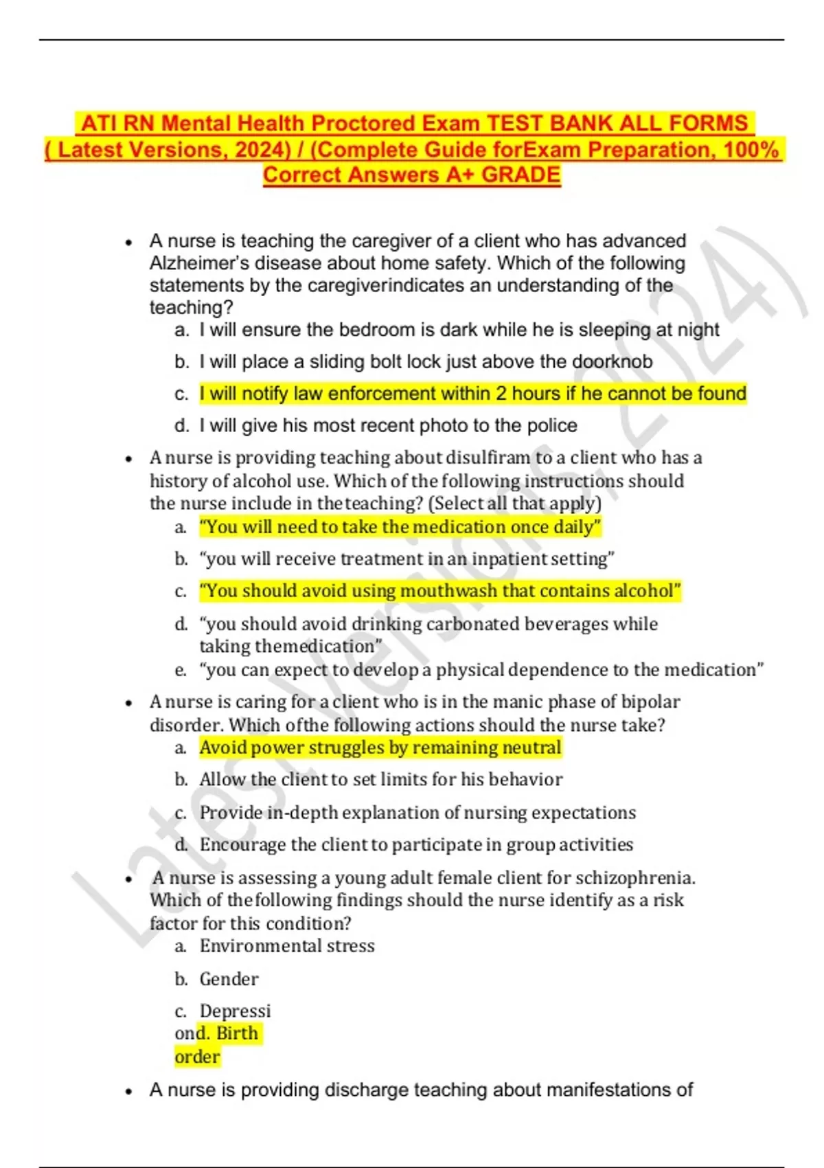 ATI RN Mental Health Proctored Exam TEST BANK ALL FORMS ( Latest Versions, 2024) / (Complete Guide for Exam Preparation, 100% Correct Answers A+ GRADE A nurse is teaching the caregiver of a client who has advanced Alzheimer’s disease about home safety. Which of the following statements by the caregiver indicates an understanding of the teaching? a.I will ensure the bedroom is dark while he is sleeping at night b.I will place a sliding bolt lock just above the doorknob c.I will notify law enforcement within 2 hours if he cannot be found d.I will give his most recent photo to the police A nurse is providing teaching about disulfiram to a client who has a history of alcohol use. Which of the following instructions should the nurse include in the teaching? (Select all that apply) a.“You will need to take the medication once daily” b.“you will receive treatment in an inpatient setting” c.“You should avoid using mouthwash that contains alcohol” d.“you should avoid drinking carbonated beverages while taking the medication” e.“you can expect to develop a physical dependence to the medication” A nurse is caring for a client who is in the manic phase of bipolar disorder. Which of the following actions should the nurse take? a.Avoid power struggles by remaining neutral b.Allow the client to set limits for his behavior c.Provide in-depth explanation of nursing expectations d.Encourage the client to participate in group activities A nurse is assessing a young adult female client for schizophrenia. Which of the following findings should the nurse identify as a risk factor for this condition? a.Environmental stress b.Gender c.Depression d. Birth order A nurse is providing discharge teaching about manifestations of relapse to the family of a client who has schizophrenia. Which of the following information should the nurse include in the teaching? a.The client exhibits an inflated sense of self b.The client develops an inability to concentrate c.The client increases participation in social activities d.The client begins sleeping more than usualnurse is assessing a client who is restless and constantly mutters to himself. Which of the following findings should lead the nurse to suspect delirium? e.The client is unable to recognize objects. f.The client manifestations developed suddenly g.The client has a flat affect h.The client’s speech is slow and repetitious A nu A nurse is caring for a client who has cocaine use disorder. Which of the following manifestations should the nurse expect the client to have during withdrawal? a.Hand tremors b.Rapid speech