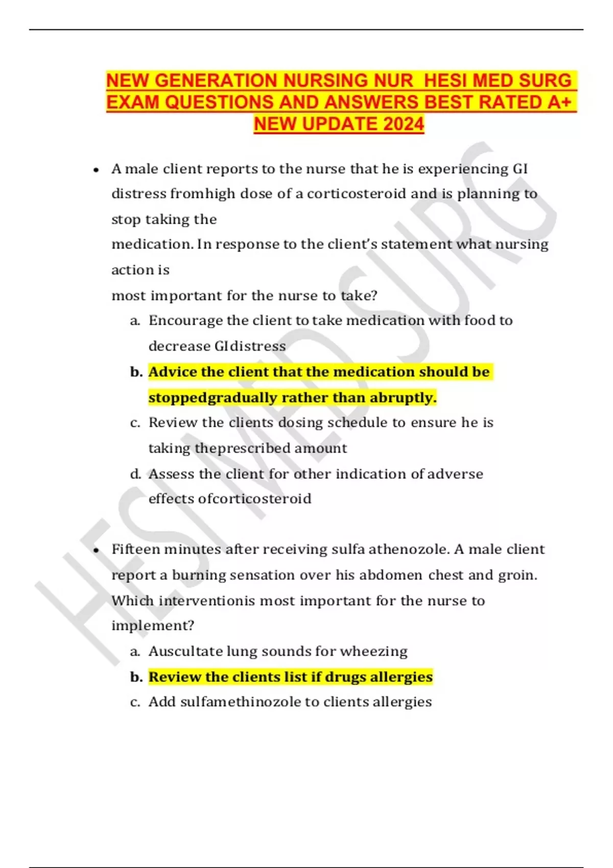 NEW GENERATION NURSING NUR HESI MED SURG EXAM QUESTIONS AND ANSWERS BEST RATED A+ NEW UPDATE 2024