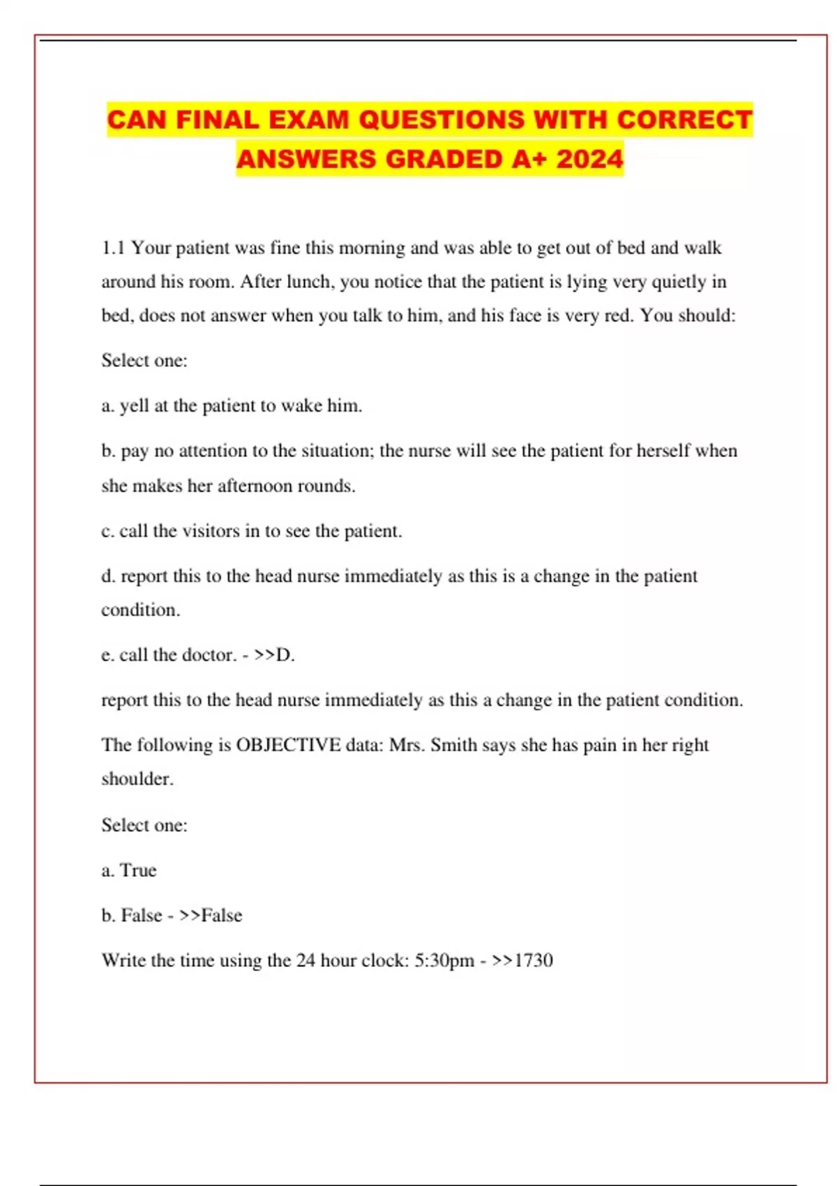 CNA EXAM QUESTION AND VERIFIED ANSWERS WITH RATIONALE 2024 COMPLETE STUDY GUIDE