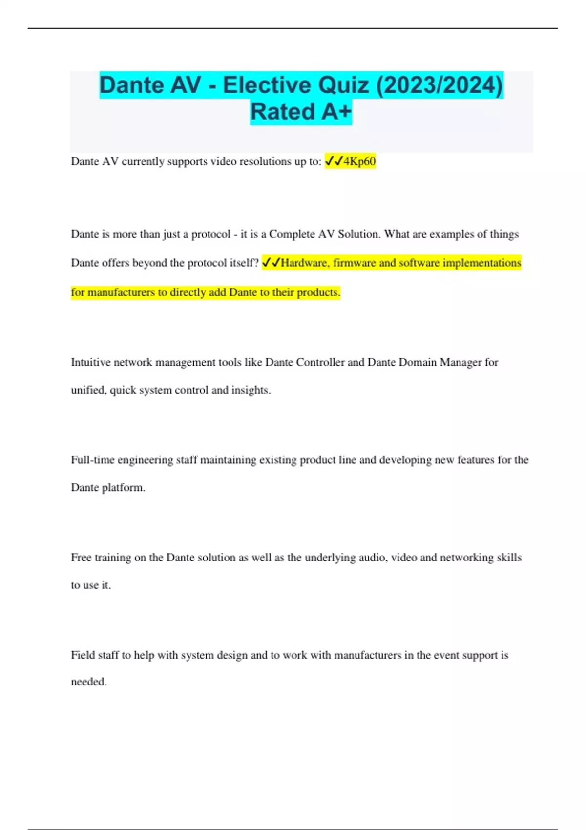 Dante AV - Elective Quiz (2023/2024) Rated A+ Dante AV currently supports video resolutions up to: 4Kp60 Dante is more than just a protocol - it is a Complete AV Solution. What are examples of things Dante offers beyond the protocol itself? Hardware, firmware and software implementations for manufacturers to directly add Dante to their products. Intuitive network management tools like Dante Controller and Dante Domain Manager for unified, quick system control and insights. Full-time engineering staff maintaining existing product line and developing new features for the Dante platform. Free training on the Dante solution as well as the underlying audio, video and networking skills to use it. Field staff to help with system design and to work with manufacturers in the event support is needed. Dante AV allows audio and video teams to coexist on the same network. As such, they will inherently synchronize together. True Which best describes Dante AV's approach to lip sync. Audio and video are maintained as separate streams, but lips sync is guaranteed between devices. Network latency is matched, and an audio buffer automatically compensates for the additional time required for video in scalers, codecs and other steps. How does Dante AV manage HDCP (High-bandwidth Digital Copy Protection)? HDCP keys are automatically managed, allowing up to 16 devices in the chain. This is true in unicast and multicast modes. Dante AV can transmit video in what method(s)? Unicast Multicast Dante AV devices were demonstrated to deliver video from transmitter HDMI port to receiver HDMI port in what latency: 8 msec The first Dante AV devices will use a JPEG 2000 codec. What are some benefits of the JPEG 2000 codec? Visually lossless picture quality No generational loss (visually lossless step for initial encode/decode, no further loss on subsequent encode/decode steps.) Low Latency More error resilient (because the codec encodes each frame fully, any errors are contained to one part of one frame) Suppose we had 10 Dante AV transmitters and 10 Dante AV receivers plugged in to a single 1Gbps network switch. Each 4K/30 4:2:2 stream could use up to 400Mbps, for a total of 4Gbps of traffic. Can the switch handle this much traffic? Yes. 1Gbps refers to the speed of a port, not the speed of a switch as a whole. Check the specifications of the switch to be sure, but most 1Gbps switches would be able to manage this load. Dante AV transmits audio and video as separate essences. So, and audio mixer can receive just the audio, and a projector could receive just the video. True