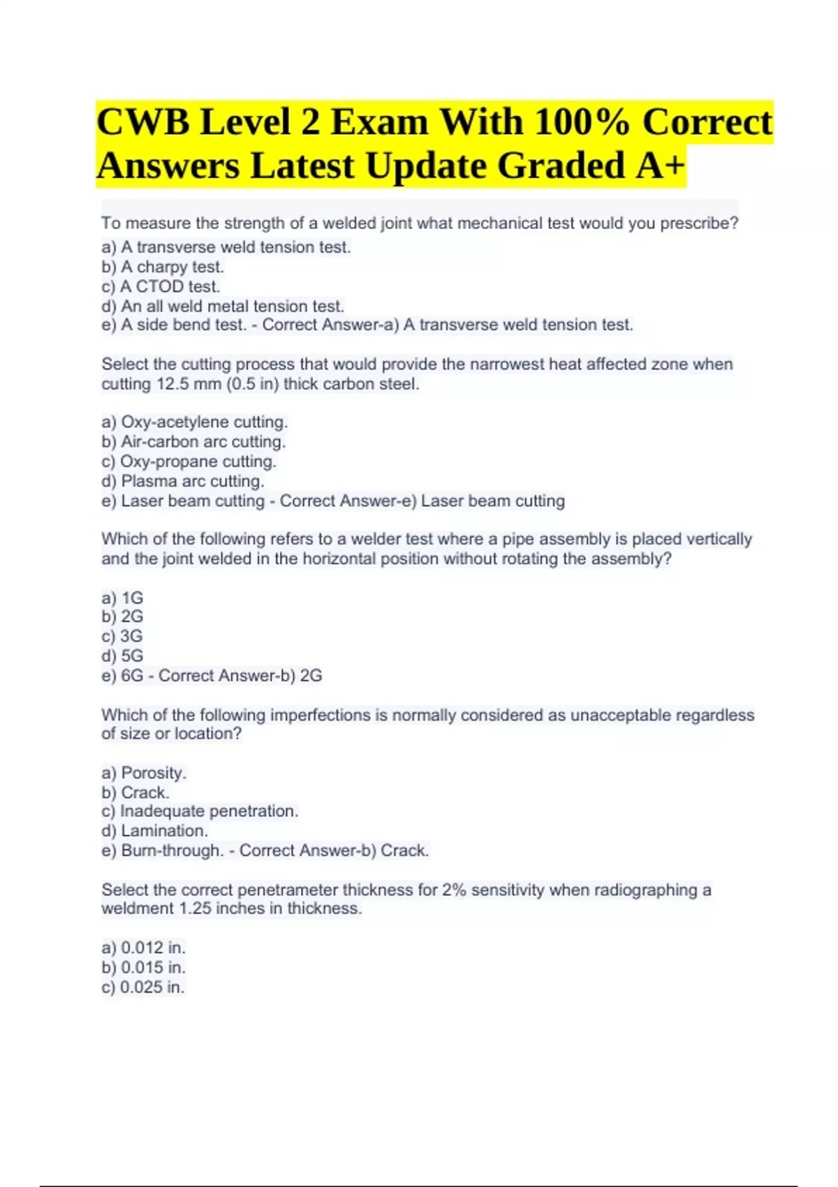 CWB Level 2 Welding Inspection Practice Questions and Answers Updated 2024 (GRADED) To measure the strength of a welded joint what mechanical test would you prescribe? a) A transverse weld tension test. b) A charpy test. c) A CTOD test. d) An all weld metal tension test. e) A side bend test. - Correct Answer-a) A transverse weld tension test. Select the cutting process that would provide the narrowest heat affected zone when cutting 12.5 mm (0.5 in) thick carbon steel. a) Oxy-acetylene cutting. b) Air-carbon arc cutting. c) Oxy-propane cutting. d) Plasma arc cutting. e) Laser beam cutting - Correct Answer-e) Laser beam cutting Which of the following refers to a welder test where a pipe assembly is placed vertically and the joint welded in the horizontal position without rotating the assembly? a) 1G b) 2G c) 3G d) 5G e) 6G - Correct Answer-b) 2G Which of the following imperfections is normally considered as unacceptable regardless of size or location? a) Porosity. b) Crack. c) Inadequate penetration. d) Lamination. e) Burn-through. - Correct Answer-b) Crack. Select the correct penetrameter thickness for 2% sensitivity when radiographing a weldment 1.25 inches in thickness. a) 0.012 in. b) 0.015 in. c) 0.025 in. CWB Level 2 Exam With 100% Correct Answers Latest Update Graded A+ d) 0.030 in. - Correct Answer-c) 0.025 in. Which of the following statements concerning porosity is true? a) Porosity cannot be trapped within a weld. b) Porosity moves up through later passes and will show only in a final pass. c) Porosity is restricted to the centre line of a weld. d) Porosity can result from faulty welder technique. e) Porosity can be dissipated by an appropriate heat treatment. - Correct Answer-d) Porosity can result from faulty welder technique. An irregular, dense white spot is seen on the radiograph of a weld. Assuming it was caused by the welding process used, which one of the processes below would be responsible?