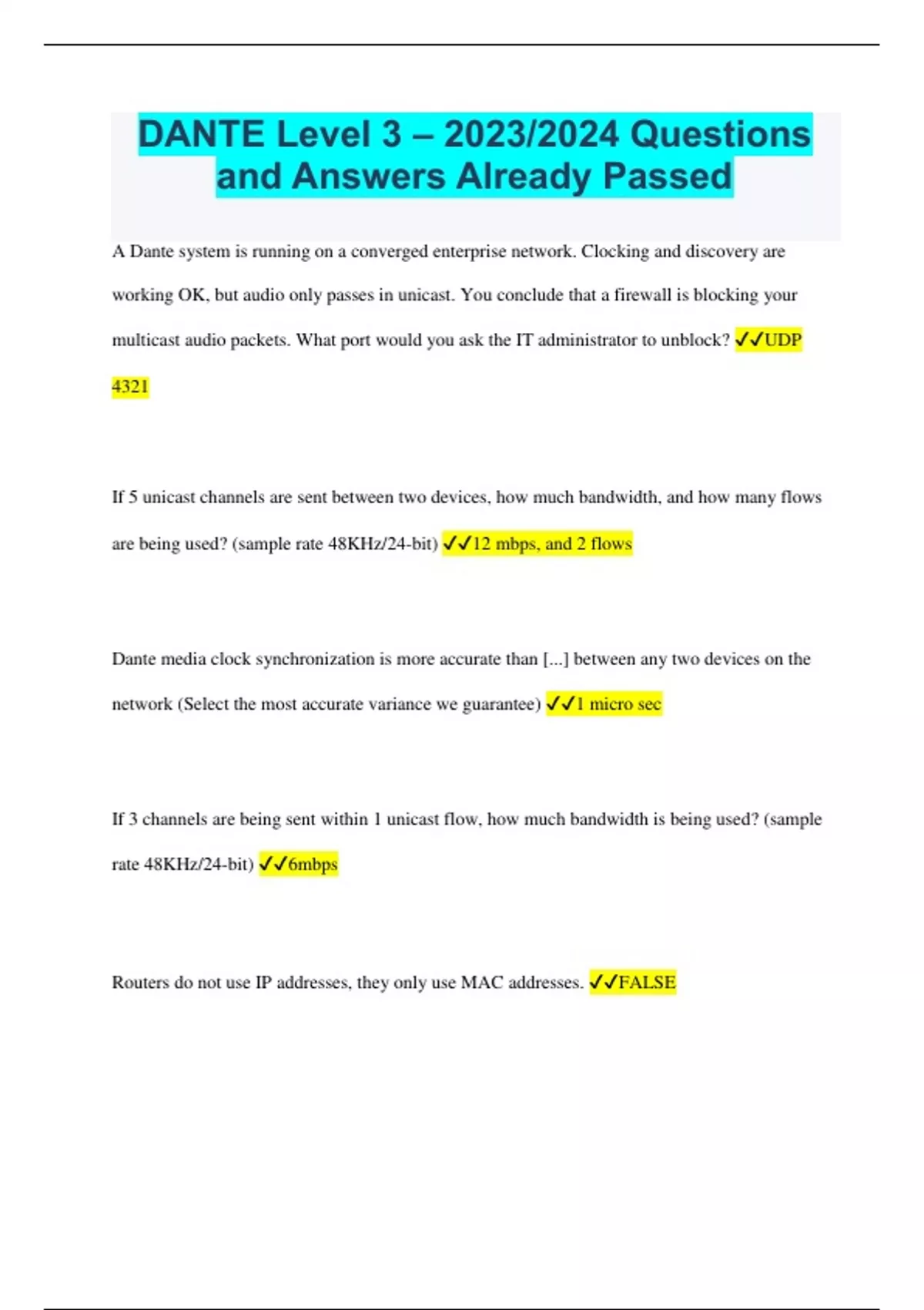 DANTE Level 3 – 2023/2024 Questions and Answers Already Passed A Dante system is running on a converged enterprise network. Clocking and discovery are working OK, but audio only passes in unicast. You conclude that a firewall is blocking your multicast audio packets. What port would you ask the IT administrator to unblock? UDP 4321 If 5 unicast channels are sent between two devices, how much bandwidth, and how many flows are being used? (sample rate 48KHz/24-bit) 12 mbps, and 2 flows Dante media clock synchronization is more accurate than [...] between any two devices on the network (Select the most accurate variance we guarantee) 1 micro sec If 3 channels are being sent within 1 unicast flow, how much bandwidth is being used? (sample rate 48KHz/24-bit) 6mbps Routers do not use IP addresses, they only use MAC addresses. FALSE On a Unicast transmission, a transmitter and receiver have latency settings of 0.25 msec and 1.00 msec, respectively. When will the audio playout of the receiving device? 1 milli seconds 1 milli seconds A Dante device can have an unlimited number of receive flows. FALSE It is a best practice (and strongly suggested) to designate unique IP subnets to each VLAN. Among other things, you'll be able to use a router to connect the devices across VLANs (via unicast). TRUE How much bandwidth does a unicast audio flow use? (Assume 48kHz, 24-bit.) 6mbps A multicast flow is initiated by a transmitter alone. TRUE A switch populates its [...] by observing the source [...] of ARP requests and responses passing through. Mac Address Table MAC Addresses IGMP snooping listens for reports to [...] messages in order to restrict [...] traffic. IGMP query, multicast The amount of bandwidth used by a multicast flow varies based on number of transmitting channels. TRUE When you know you will be configuring switches with features like IGMP Snooping, there is no hesitation in combining managed switches from different manufacturers in your design. FALSE How can you find out how many transmit flows a device is using? In Dante Controller, go to Device View, Tx tab Dante devices automatically change unicast flows to multicast when a fan-out is detected. False A Dante system is using a mix of Brooklyn II (1Gbps) and Ultimo (100Mbps) devices. The system has run continuously for at least 5 days, though system operators suggest they hear occasional sound distortions. You notice audio multicast bandwidth has accumulated to 90Mbps. What would be the potential solution for this? Turn on IGMP Snooping When a system will implement redundant networks, the preferred method for commissioning is: Bring one network online at a time, ensur