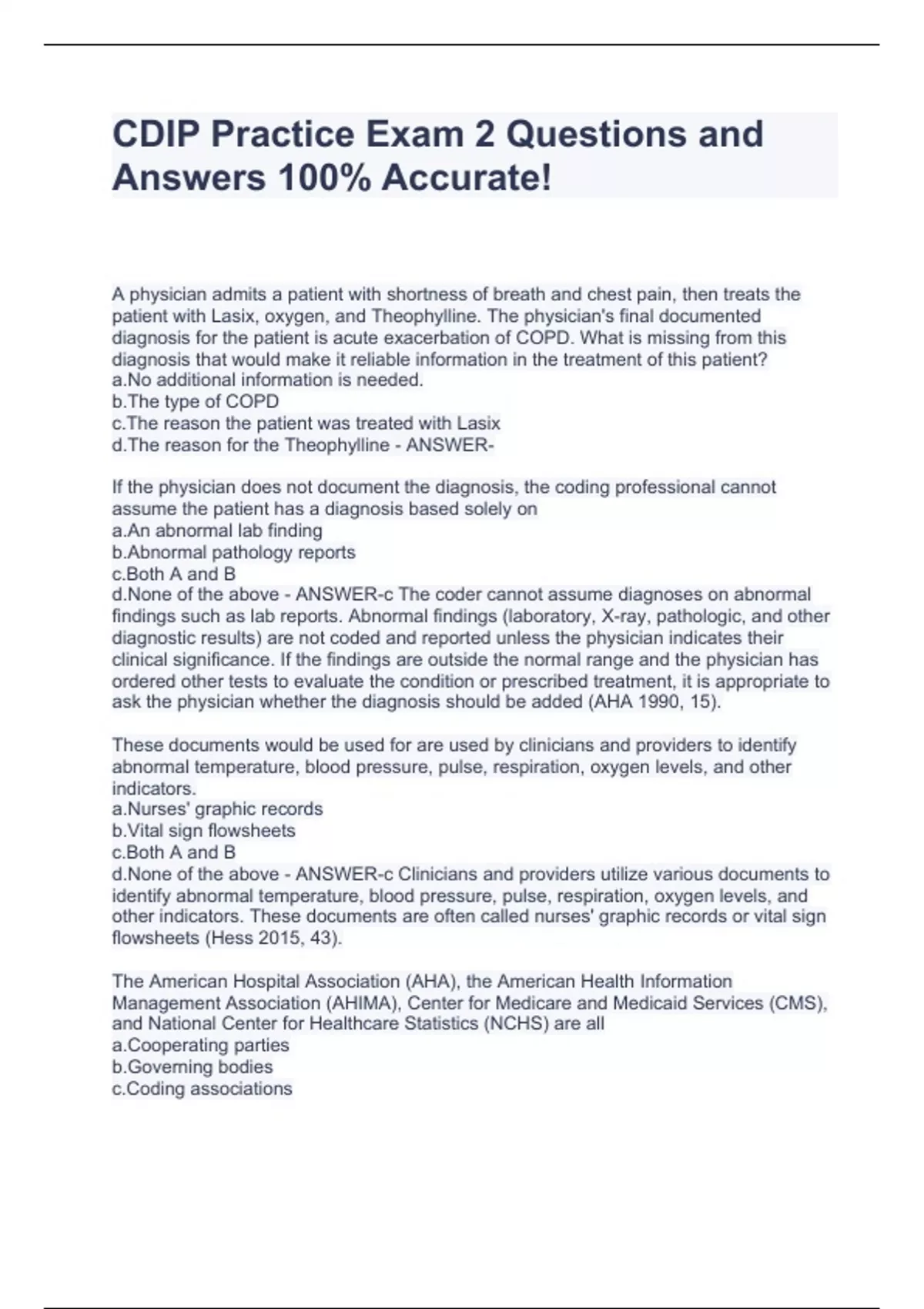 A physician admits a patient with shortness of breath and chest pain, then treats the patient with Lasix, oxygen, and Theophylline. The physician's final documented diagnosis for the patient is acute exacerbation of COPD. What is missing from this diagnosis that would make it reliable information in the treatment of this patient? a.No additional information is needed. b.The type of COPD c.The reason the patient was treated with Lasix d.The reason for the Theophylline - ANSWER- If the physician does not document the diagnosis, the coding professional cannot assume the patient has a diagnosis based solely on a.An abnormal lab finding b.Abnormal pathology reports c.Both A and B d.None of the above - ANSWER-c The coder cannot assume diagnoses on abnormal findings such as lab reports. Abnormal findings (laboratory, X-ray, pathologic, and other diagnostic results) are not coded and reported unless the physician indicates their clinical significance. If the findings are outside the normal range and the physician has ordered other tests to evaluate the condition or prescribed treatment, it is appropriate to ask the physician whether the diagnosis should be added (AHA 1990, 15). These documents would be used for are used by clinicians and providers to identify abnormal temperature, blood pressure, pulse, respiration, oxygen levels, and other indicators. a.Nurses' graphic records b.Vital sign flowsheets c.Both A and B d.None of the above - ANSWER-c Clinicians and providers utilize various documents to identify abnormal temperature, blood pressure, pulse, respiration, oxygen levels, and other indicators. These documents are often called nurses' graphic records or vital sign flowsheets (Hess 2015, 43). The American Hospital Association (AHA), the American Health Information Management Association (AHIMA), Center for Medicare and Medicaid Services (CMS), and National Center for Healthcare Statistics (NCHS) are all a.Cooperating parties b.Governing bodies c.Coding associations d.Work independently to develop coding guidelines - ANSWER-a The American Hospital Association (AHA), the American Health Information Management Association (AHIMA), Center for Medicare and Medicaid Services (CMS), and National Center for Health Statistics (NCHS) are all cooperating parties that developed and approved ICD-10-CM/PCS (ICD-10-CM Official Guidelines for Coding and Reporting 2016a, 1). A patient was admitted with HIV and pneumocystic carini. The patient should have a principal diagnosis in ICD-10 of: a.AIDS b.Asymptomatic HIV c.Pneumonia d.Not enough information - ANSWER-a If a patient is admitted for an HIV-related condition, the principal diagnosis should be B20, Human immunodeficiency virus [HIV] disease followed by additional diagnosis codes for all reported HIV-related conditions (ICD-10-CM Official Guidelines for Coding and Reporting 2016a, 17). APR-DRGs have levels (subclasses) of severity entitled: a.Excessive, Major, Moderate, Minor b.Extreme, Major, Moderate, Minor c.Extreme, Major, Moderate, Minimal d.Excessive, Major - ANSWER-b The APR-DRG system is distributed into levels (subcla