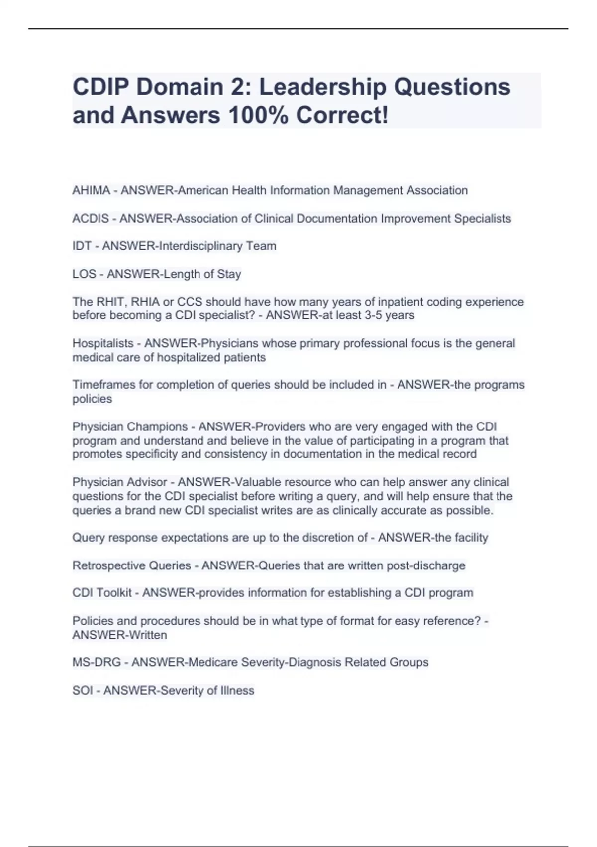 AHIMA - ANSWER-American Health Information Management Association ACDIS - ANSWER-Association of Clinical Documentation Improvement Specialists IDT - ANSWER-Interdisciplinary Team LOS - ANSWER-Length of Stay The RHIT, RHIA or CCS should have how many years of inpatient coding experience before becoming a CDI specialist? - ANSWER-at least 3-5 years Hospitalists - ANSWER-Physicians whose primary professional focus is the general medical care of hospitalized patients Timeframes for completion of queries should be included in - ANSWER-the programs policies Physician Champions - ANSWER-Providers who are very engaged with the CDI program and understand and believe in the value of participating in a program that promotes specificity and consistency in documentation in the medical record Physician Advisor - ANSWER-Valuable resource who can help answer any clinical questions for the CDI specialist before writing a query, and will help ensure that the queries a brand new CDI specialist writes are as clinically accurate as possible. Query response expectations are up to the discretion of - ANSWER-the facility Retrospective Queries - ANSWER-Queries that are written post-discharge CDI Toolkit - ANSWER-provides information for establishing a CDI program Policies and procedures should be in what type of format for easy reference? - ANSWER-Written MS-DRG - ANSWER-Medicare Severity-Diagnosis Related Groups SOI - ANSWER-Severity of Illness ROM