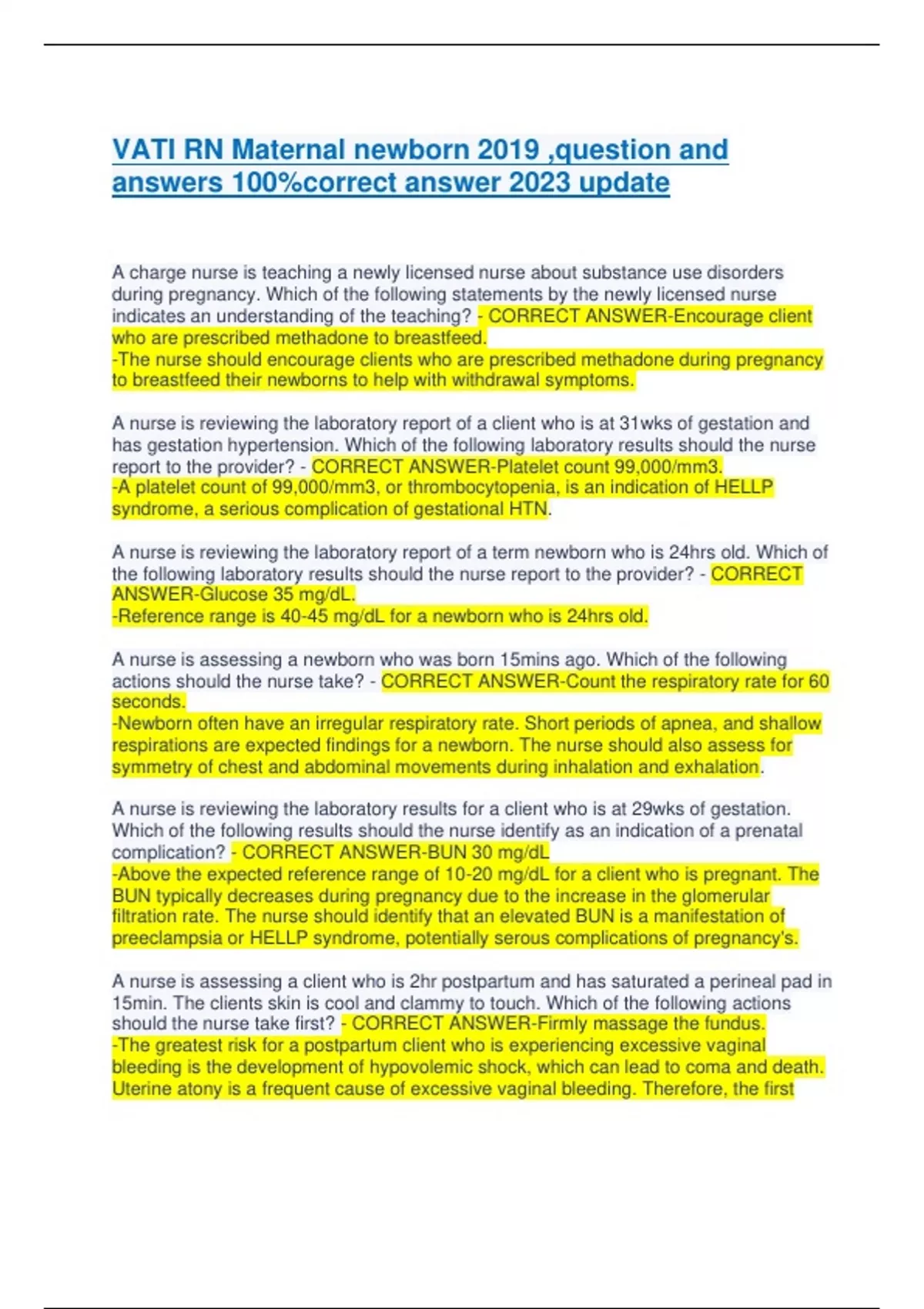 VATI RN Maternal newborn 2019 ,question and answers 100%correct answer 2023 update A charge nurse is teaching a newly licensed nurse about substance use disorders during pregnancy. Which of the following statements by the newly licensed nurse indicates an understanding of the teaching? - CORRECT ANSWER-Encourage client who are prescribed methadone to breastfeed. -The nurse should encourage clients who are prescribed methadone during pregnancy to breastfeed their newborns to help with withdrawal symptoms. A nurse is reviewing the laboratory report of a client who is at 31wks of gestation and has gestation hypertension. Which of the following laboratory results should the nurse report to the provider? - CORRECT ANSWER-Platelet count 99,000/mm3. -A platelet count of 99,000/mm3, or thrombocytopenia, is an indication of HELLP syndrome, a serious complication of gestational HTN. A nurse is reviewing the laboratory report of a term newborn who is 24hrs old. Which of the following laboratory results should the nurse report to the provider? - CORRECT ANSWER-Glucose 35 mg/dL. -Reference range is 40-45 mg/dL for a newborn who is 24hrs old. A nurse is assessing a newborn who was born 15mins ago. Which of the following actions should the nurse take? - CORRECT ANSWER-Count the respiratory rate for 60 seconds. -Newborn often have an irregular respiratory rate. Short periods of apnea, and shallow respirations are expected findings for a newborn. The nurse should also assess for symmetry of chest and abdominal movements during inhalation and exhalation. A nurse is reviewing the laboratory results for a client who is at 29wks of gestation. Which of the following results should the nurse identify as an indication of a prenatal complication? - CORRECT ANSWER-BUN 30 mg/dL -Above the expected reference range of 10-20 mg/dL for a client who is pregnant. The BUN typically decreases during pregnancy due to the increase in the glomerular filtration rate. The nurse should identify that an elevated BUN is a manifestation of preeclampsia or HELLP syndrome, potentially serous complications of pregnancy's. A nurse is assessing a client who is 2hr postpartum and has saturated a perineal pad in 15min. The clients skin is cool and clammy to touch. Which of the following actions should the nurse take first? - CORRECT ANSWER-Firmly massage the fundus. -The greatest risk for a postpartum client who is experiencing excessive vaginal bleeding is the development of hypovolemic shock, which can lead to coma and death. Uterine atony is a frequent cause of excessive vaginal bleeding. Therefore, the first action the nurse should take is to massage the clients fundus to encourage muscular contractions, which will decrease bleeding. A nurse is caring for a client who is at 28wks of gestation and has received two doses of terbutaline subcutaneously. Which of the following adverse effects is the priority for the nurse to report to the provider? - CORRECT ANSWER-Heart rate: 132/min -The nurse should notify the provider of tachycardia greater than 130/min; therefore, this is the priority finding. The client might also report chest discomfort, palpitations and have arrhythmias. A nurse is providing teaching for a client who is 2wks postpartum and has mastitis. Which of the following instructions should the nurse include in the teaching? - CORRECT ANSWER-Apply moist heat to the affected breast. -The application of warm compresses prior to feeding or pumping promotes the flow of the breast milk and assists to ensure complete emptying of the breast. This is important to prevent the development of further complications such as the formation of a breast abscess or chronic mastitis. A nurse is admitting a client who is at 39wks of gestation and in active labor. The client reports being positive for group B streptococcus (GBS) when screened at 36wks of gestation. Which of the following actions should the nurse expect to take? - CORRECT ANSWER-Administer IV antibiotic prophylaxis. -To decrease the risk of the neonate contracting a GBS infection, it is recommended that pregnant clients who test positive for GBS receive antibiotics during labor. A nurse is reviewing the results of a nonstress test for a client who is at 37wks of gestation. Which of the following findings indicates a reactive nonstress test? - CORRECT ANSWER-Fetal heart rate (FHR) accelerations occur with fetal movement. -A nonstress test measures the response of the FHR to fetal movement. Accelerations of the FHR with fetal movement are a reassuring sign of fetal well being. A nurse is providing teaching about nifedipine for a client who is at 34wks of gestation and has gestational HTN. For which of the following adverse effects should the nurse instruct the client to notify the provider? - CORRECT ANSWER-Irregular heartbeat. -Cardiac arrhythmia is a potential life-threatening adverse effect of nifedipine. Therefore, the client should report an irregular heartbeat to the provider. A nurse is caring for a client who is at 30 weeks of gestation and observes the client choking while eating lunch. The client is unable to speak or cough. Identify the sequence of steps the nurse should take to clear the airway obstruction. - CORRECT ANSWER-1. Stand posterior to the client. 2. Position arms under the client's axilla and across the client's chest. 3. Place thumb-side of a clenched fist to the client's mid-sternum area. 4. Initiate chest thrust to the client using a backward motion. -If the client becomes unconscious, the nurse should perform CPR and activate emergency medical services.
