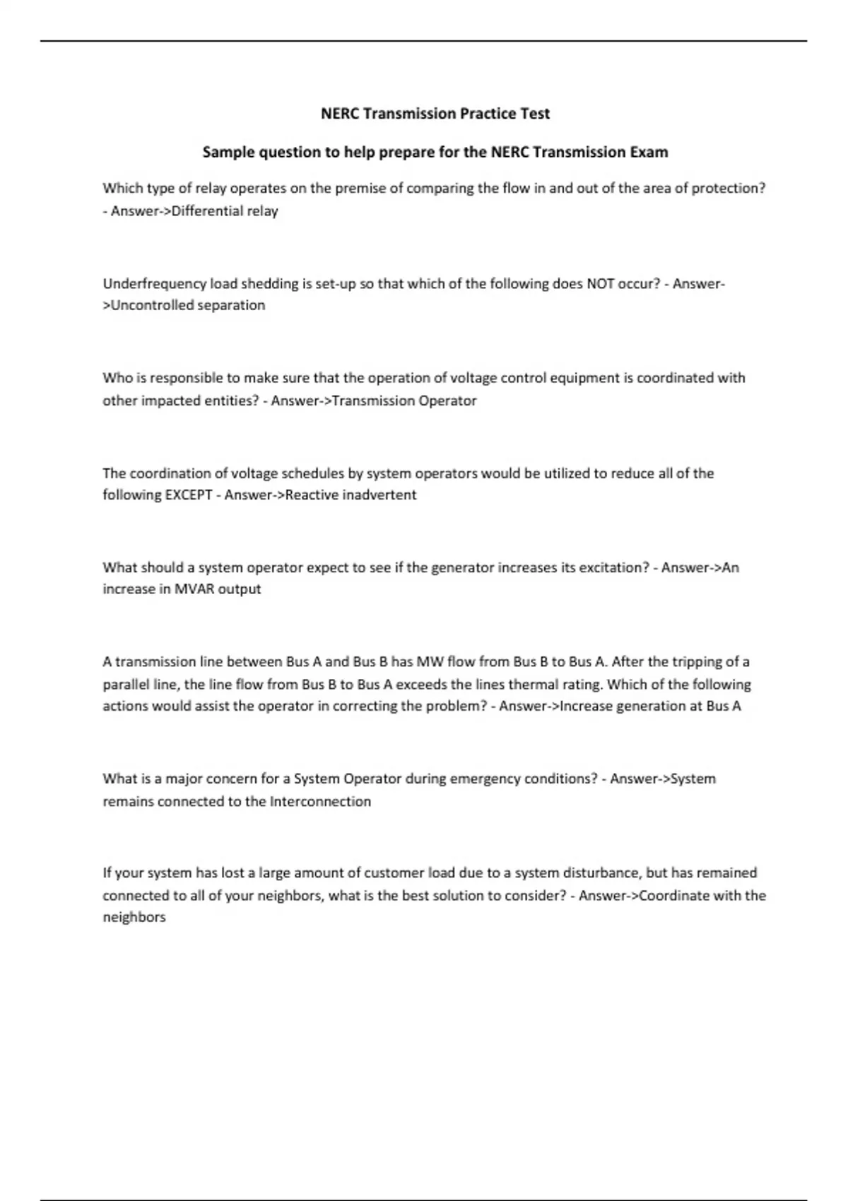 NERC Transmission Practice Test Sample question to help prepare for the NERC Transmission Exam Which type of relay operates on the premise of comparing the flow in and out of the area of protection? - Answer-Differential relay Underfrequency load shedding is set-up so that which of the following does NOT occur? - Answer- Uncontrolled separation Who is responsible to make sure that the operation of voltage control equipment is coordinated with other impacted entities? - Answer-Transmission Operator The coordination of voltage schedules by system operators would be utilized to reduce all of the following EXCEPT - Answer-Reactive inadvertent What should a system operator expect to see if the generator increases its excitation? - Answer-An increase in MVAR output A transmission line between Bus A and Bus B has MW flow from Bus B to Bus A. After the tripping of a parallel line, the line flow from Bus B to Bus A exceeds the lines thermal rating. Which of the following actions would assist the operator in correcting the problem? - Answer-Increase generation at Bus A What is a major concern for a System Operator during emergency conditions? - Answer-System remains connected to the Interconnection If your system has lost a large amount of customer load due to a system disturbance, but has remained connected to all of your neighbors, what is the best solution to consider? - Answer-