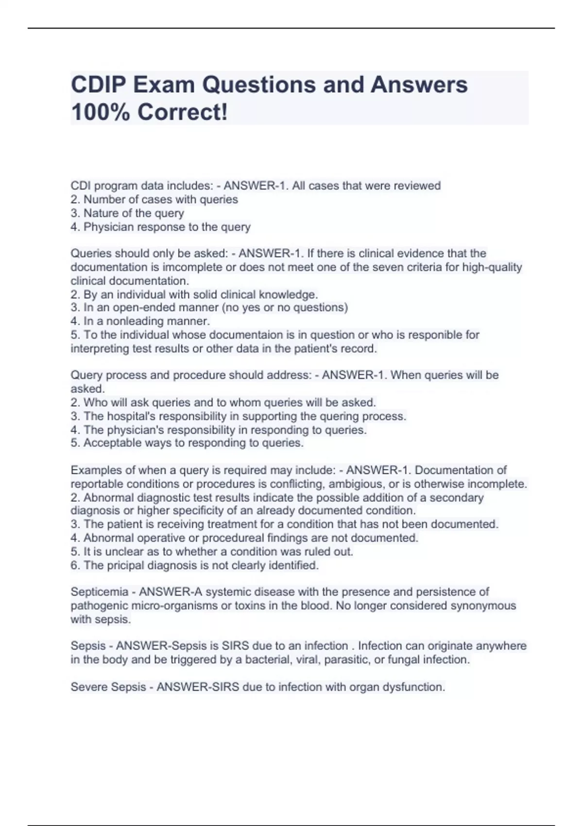 CDI program data includes: - ANSWER-1. All cases that were reviewed 2. Number of cases with queries 3. Nature of the query 4. Physician response to the query Queries should only be asked: - ANSWER-1. If there is clinical evidence that the documentation is imcomplete or does not meet one of the seven criteria for high-quality clinical documentation. 2. By an individual with solid clinical knowledge. 3. In an open-ended manner (no yes or no questions) 4. In a nonleading manner. 5. To the individual whose documentaion is in question or who is responible for interpreting test results or other data in the patient's record. Query process and procedure should address: - ANSWER-1. When queries will be asked. 2. Who will ask queries and to whom queries will be asked. 3. The hospital's responsibility in supporting the quering process. 4. The physician's responsibility in responding to queries. 5. Acceptable ways to responding to queries. Examples of when a query is required may include: - ANSWER-1. Documentation of reportable conditions or procedures is conflicting, ambigious, or is otherwise incomplete. 2. Abnormal diagnostic test results indicate the possible addition of a secondary diagnosis or higher specificity of an already documented condition. 3. The patient is receiving treatment for a condition that has not been documented. 4. Abnormal operative or procedureal findings are not documented. 5. It is unclear as to whether a condition was ruled out. 6. The pricipal diagnosis is not clearly identified. Septicemia - ANSWER-A systemic disease with the presence and persistence of pathogenic micro-organisms or toxins in the blood. No longer considered synonymous with sepsis. Sepsis - ANSWER-Sepsis is SIRS due to an infection . Infection can originate anywhere in the body and be triggered by a bacterial, viral, parasitic, or fungal infection. Severe Sepsis - ANSWER-SIRS due to infection with organ dysfunction. Sepsis associated with acute dysfunction in one or more organs. Organ dysfunction bay be cardiovascular, renal, respiratory, hepatic, hematological, central nervous system, or metabolic acidosis. SIRS - ANSWER-SIRS is the systemic response to infection or trauma. The systemic response is manifested by a variety of clinical signs and symptoms such as: Fever (>100.4 degrees F), Hypothermia (<96.8 degrees F), WBC >= to 12000 cellsmm3 (leukocytosis), WBC <= to 4000 cells/mm3 or 10% immature cells, heart reat >90 bpm, respirations >20 breaths/minute or PcCO2 <32 mg of mercury, hypotension, altered mental status. Septic Shock - ANSWER-Sepsis with hypotension or a failure of the cardiovascular system. Endotoxic shock and gram negative shock are synomymous with septic shock, septic shock = severe sepsis Bacteremia - ANSWER-Bacteria in the blood without an associated inflammatory response. Denotes laboratory findings of viable bateria in the blood with no systemic manifestations. Progresses to septicemia only when there is a more severe infections process or an impaired immune system. Urosepsis - ANSWER-Infection confined to the urinary system. Refers to pyuria or bacteria in the urine (not in the blood). Query the physician to determine if the bacteria in the urine has progressed to septicemia or sepsis. 7 criteria f