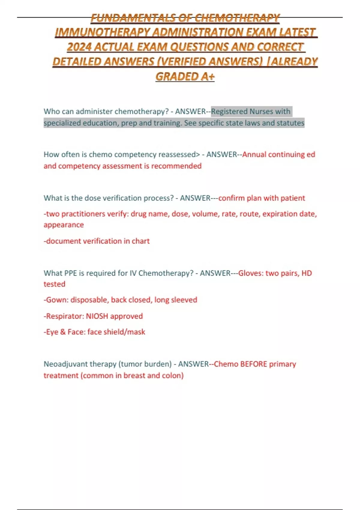 FUNDAMENTALS OF CHEMOTHERAPY IMMUNOTHERAPY ADMINISTRATION EXAM LATEST 2024 ACTUAL EXAM QUESTIONS AND CORRECT DETAILED ANSWERS (VERIFIED ANSWERS) |ALREADY GRADED A+
