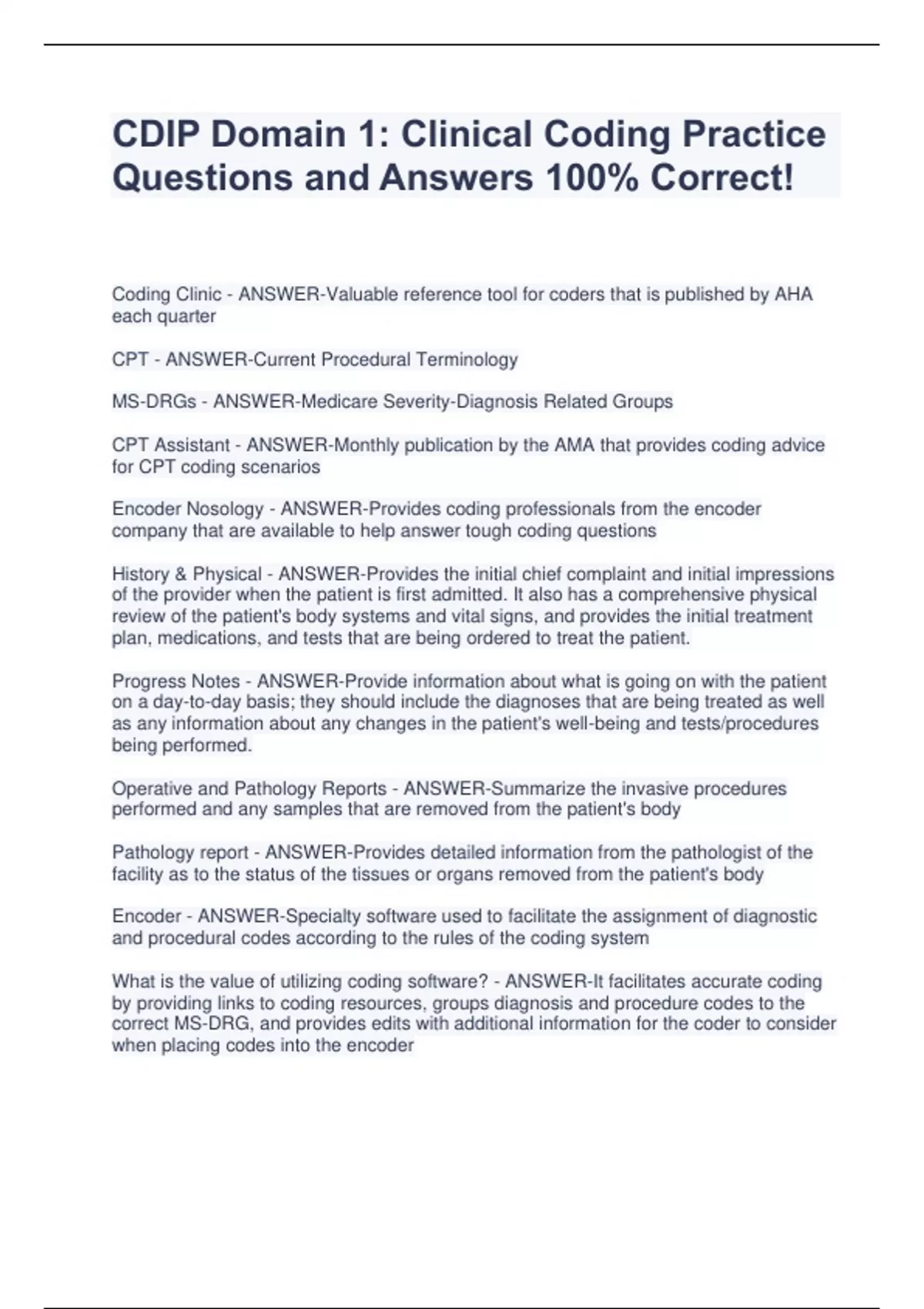 Coding Clinic - ANSWER-Valuable reference tool for coders that is published by AHA each quarter CPT - ANSWER-Current Procedural Terminology MS-DRGs - ANSWER-Medicare Severity-Diagnosis Related Groups CPT Assistant - ANSWER-Monthly publication by the AMA that provides coding advice for CPT coding scenarios Encoder Nosology - ANSWER-Provides coding professionals from the encoder company that are available to help answer tough coding questions History & Physical - ANSWER-Provides the initial chief complaint and initial impressions of the provider when the patient is first admitted. It also has a comprehensive physical review of the patient's body systems and vital signs, and provides the initial treatment plan, medications, and tests that are being ordered to treat the patient. Progress Notes - ANSWER-Provide information about what is going on with the patient on a day-to-day basis; they should include the diagnoses that are being treated as well as any information about any changes in the patient's well-being and tests/procedures being performed. Operative and Pathology Reports - ANSWER-Summarize the invasive procedures performed and any samples that are removed from the patient's body Pathology report - ANSWER-Provides detailed information from the pathologist of the facility as to the status of the tissues or organs removed from the patient's body Encoder - ANSWER-Specialty software used to facilitate the assignment of diagnostic and procedural codes according to the rules of the coding system What is the value of utilizing coding software? - ANSWER-It facilitates accurate coding by providing links to coding resources, groups diagnosis and procedure codes to the correct MS-DRG, and provides edits with additional information for the coder to consider when placing codes into the encoder Principal diagnosis - ANSWER-Diagnosis that, after study, is the reason for the patient's admission to the hospital. Secondary diagnoses - ANSWER-Additional supporting information for the conditions the pat
