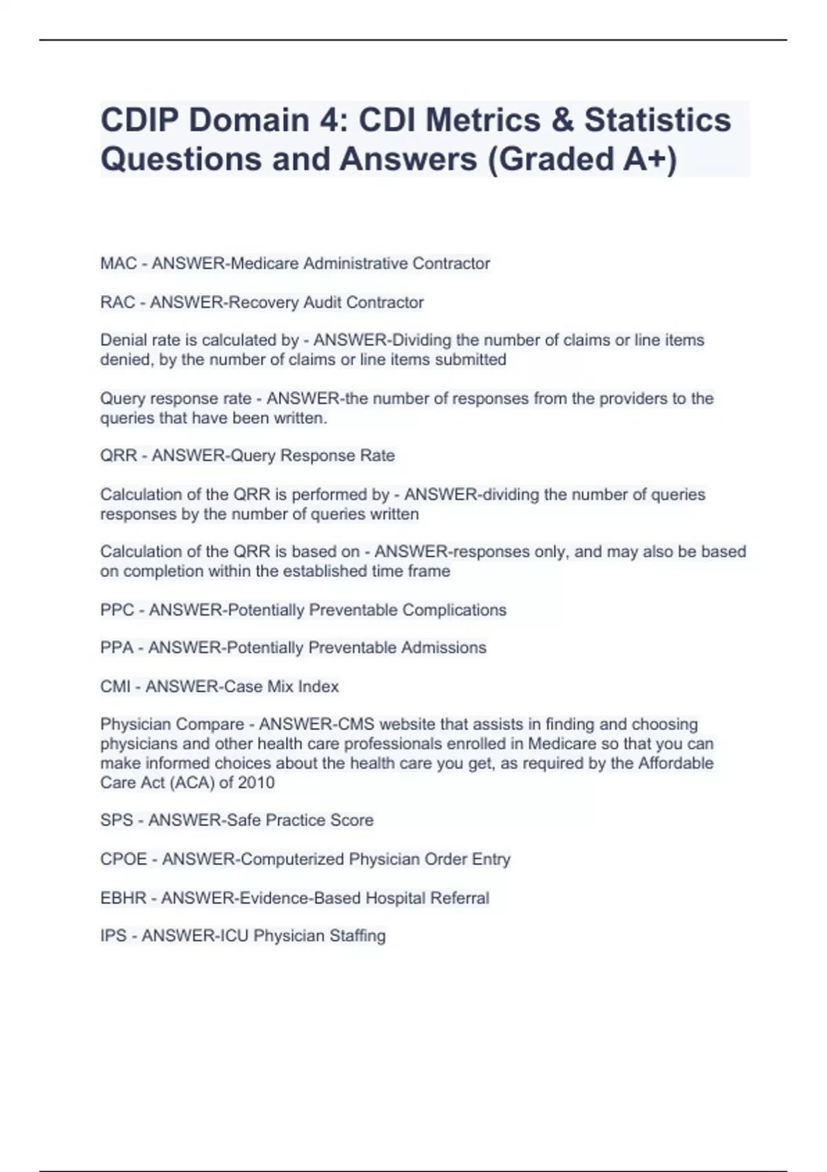 MAC - ANSWER-Medicare Administrative Contractor RAC - ANSWER-Recovery Audit Contractor Denial rate is calculated by - ANSWER-Dividing the number of claims or line items denied, by the number of claims or line items submitted Query response rate - ANSWER-the number of responses from the providers to the queries that have been written. QRR - ANSWER-Query Response Rate Calculation of the QRR is performed by - ANSWER-dividing the number of queries responses by the number of queries written Calculation of the QRR is based on - ANSWER-responses only, and may also be based on completion within the established time frame PPC - ANSWER-Potentially Preventable Complications PPA - ANSWER-Potentially Preventable Admissions CMI - ANSWER-Case Mix Index Physician Compare - ANSWER-CMS website that assists in finding and choosing physicians and other health care professionals enrolled in Medicare so that you can make informed choices about the health care you get, as required by the Affordable Care Act (ACA) of 2010 SPS - ANSWER-Safe Practice Score CPOE - ANSWER-Computerized Physician Order Entry EBHR - ANSWER-Evidence-Based Hospital Referral IPS - ANSWER-ICU Physician Staffing HCAHPS - ANSWER-Hospital Consumer Assessment of Healthcare Providers and Systems Hospital Compare - ANSWER-A consumer-oriented website that provides information on how well hospitals provide recommended care to their patients. Can be used to assist consumers with making informed decisions about health care. Agree/disagree rate - ANSWER-a way to measure the manner in which the physician and the CDI program staff are clear in their understanding of the query and the CDI proces