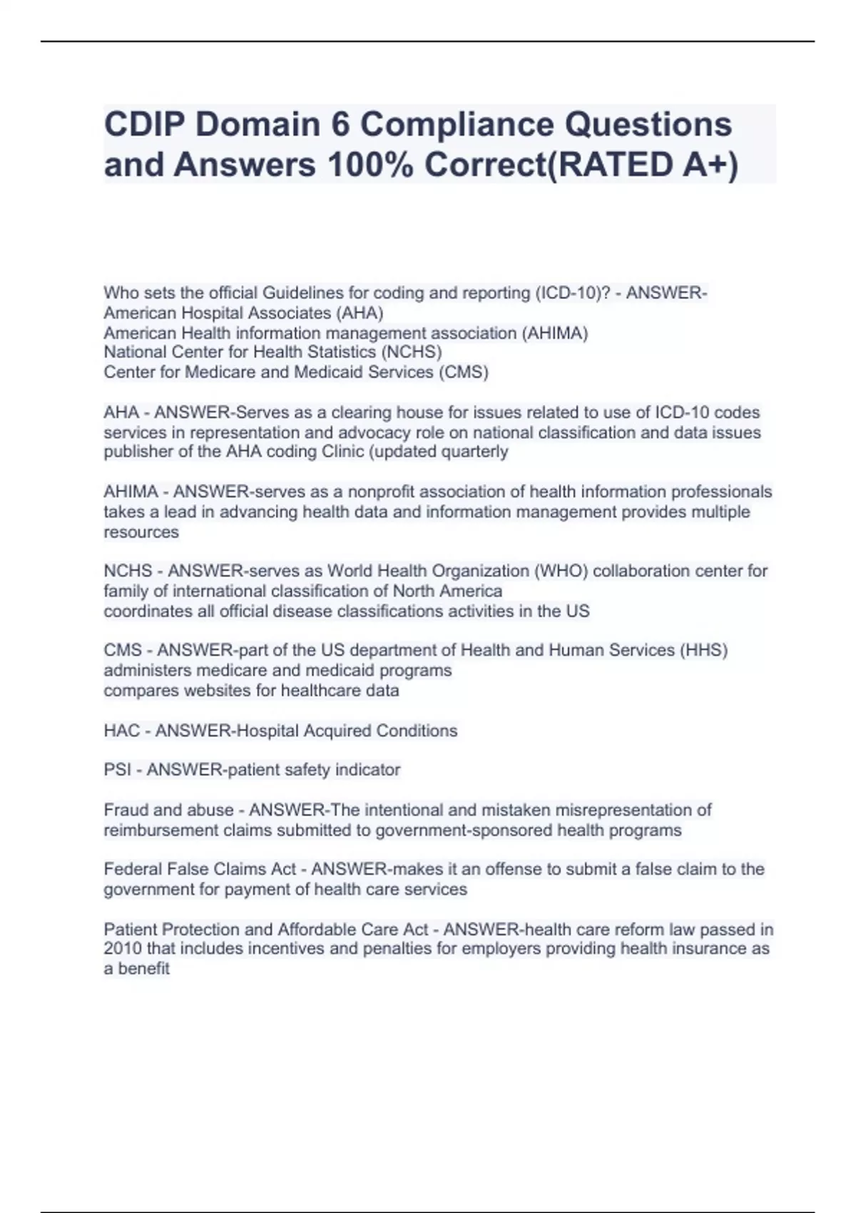 Who sets the official Guidelines for coding and reporting (ICD-10)? - ANSWER-American Hospital Associates (AHA) American Health information management association (AHIMA) National Center for Health Statistics (NCHS) Center for Medicare and Medicaid Services (CMS) AHA - ANSWER-Serves as a clearing house for issues related to use of ICD-10 codes services in representation and advocacy role on national classification and data issues publisher of the AHA coding Clinic (updated quarterly AHIMA - ANSWER-serves as a nonprofit association of health information professionals takes a lead in advancing health data and information management provides multiple resources NCHS - ANSWER-serves as World Health Organization (WHO) collaboration center for family of international classification of North America coordinates all official disease classifications activities in the US CMS - ANSWER-part of the US department of Health and Human Services (HHS) administers medicare and medicaid programs compares websites for healthcare data HAC - ANSWER-Hospital Acquired Conditions PSI - ANSWER-patient safety indicator Fraud and abuse - ANSWER-The intentional and mistaken misrepresentation of reimbursement claims submitted to government-sponsored health programs Federal False Claims Act - ANSWER-makes it an offense to submit a false claim to the government for payment of health care services Patient Protection and Affordable Care Act - ANSWER-health care reform law passed in 2010 that includes incentives and penalties for employers providing health insurance as a benefit Title XI of the social security activities - ANSWER-exclusion from the federal payer program if convicted of misconduct Compliance - ANSWER-the tendency to agree to do things requested by others HIPAA - ANSWER-The Health Insurance Portability and Accountability Act, a federal law