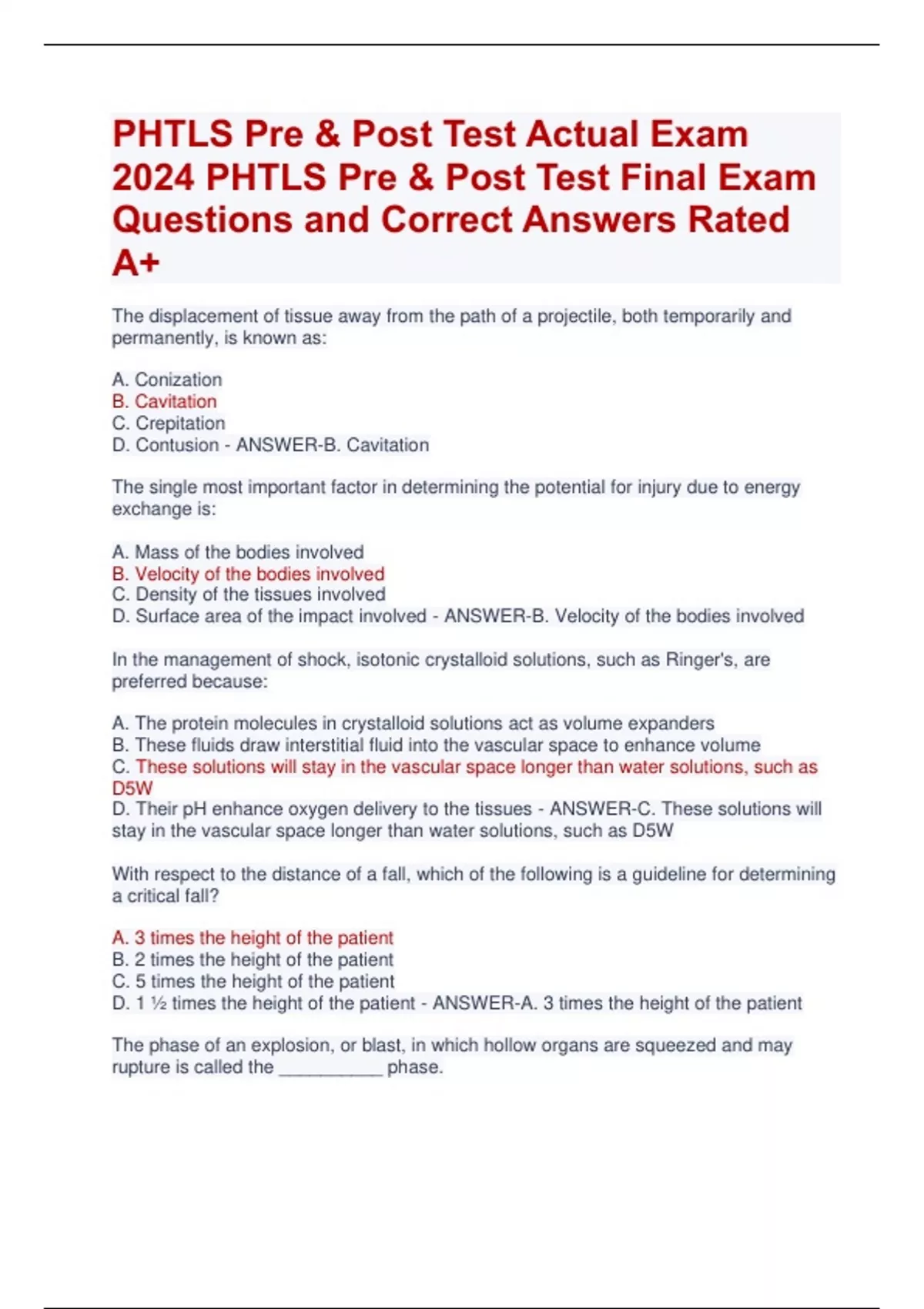 PHTLS Pre & Post Test Actual Exam 2024 PHTLS Pre & Post Test Final Exam Questions and Correct Answers Rated A+