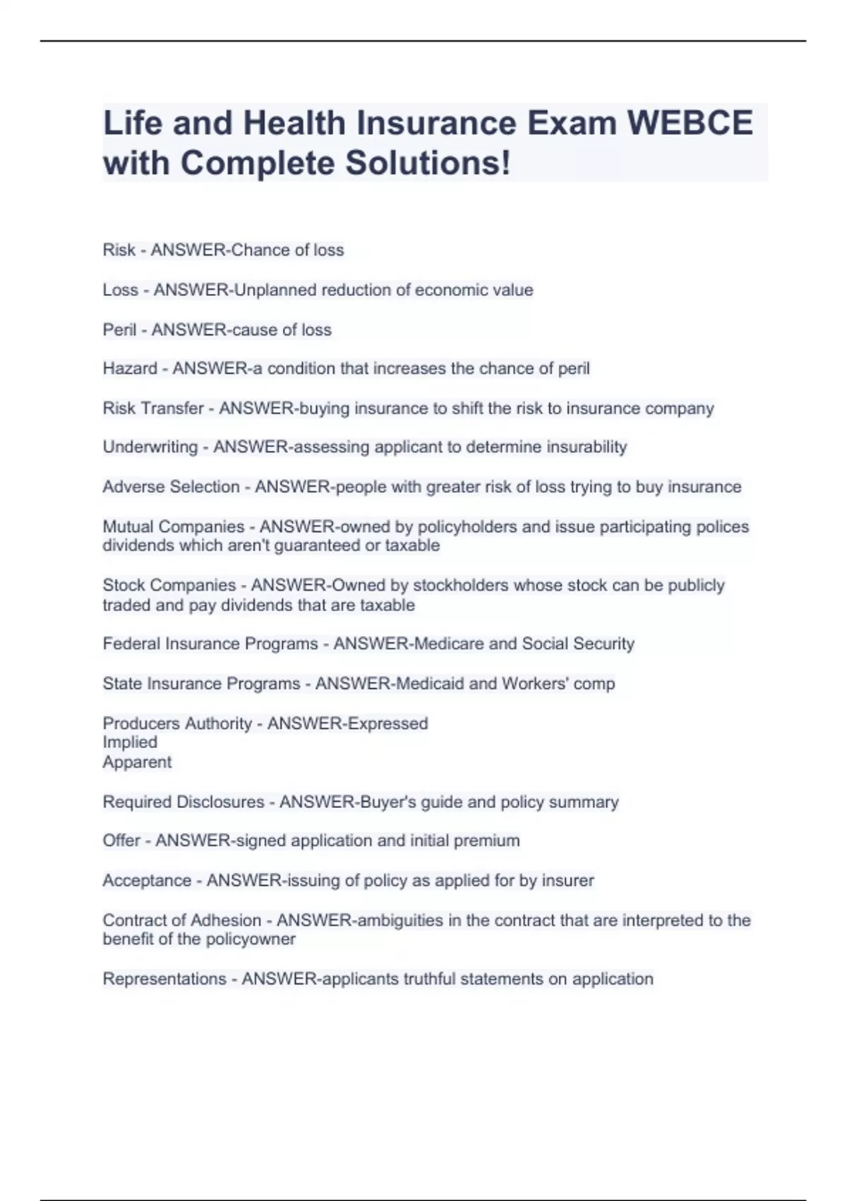 Risk - ANSWER-Chance of loss Loss - ANSWER-Unplanned reduction of economic value Peril - ANSWER-cause of loss Hazard - ANSWER-a condition that increases the chance of peril Risk Transfer - ANSWER-buying insurance to shift the risk to insurance company Underwriting - ANSWER-assessing applicant to determine insurability Adverse Selection - ANSWER-people with greater risk of loss trying to buy insurance Mutual Companies - ANSWER-owned by policyholders and issue participating polices dividends which aren't guaranteed or taxable Stock Companies - ANSWER-Owned by stockholders whose stock can be publicly traded and pay dividends that are taxable Federal Insurance Programs - ANSWER-Medicare and Social Security State Insurance Programs - ANSWER-Medicaid and Workers' comp Producers Authority - ANSWER-Expressed Implied Apparent Required Disclosures - ANSWER-Buyer's guide and policy summary Offer - ANSWER-signed application and initial premium Acceptance - ANSWER-issuing of policy as applied for by insurer Contract of Adhesion - ANSWER-ambiguities in the contract that are interpreted to the benefit of the policyowner Representations - ANSWER-applicants truthful statements on application Ways to manage risk - ANSWER-Transfer Avoid Retain Reduce Share with others Speculative Risk - ANSWER-result in loss or gain, noninsurable Moral Hazard - ANSWER-character weakness like habits or lifestyle Morale Hazard - ANSWER-State of mind or carless attitude Physical Hazard - ANSWER-physical condition that increases ones less like heavy drinking or smoking Managed Care Service Providers - ANSWER-blend of commercial and medical insurance like blue cross blue shield Fraternal benefit society - ANSWER-An organization formed to provide insurance benefits for affiliated members Self Insurer - ANSWER-large companies that can cover losses, must follow laws and pay for itself