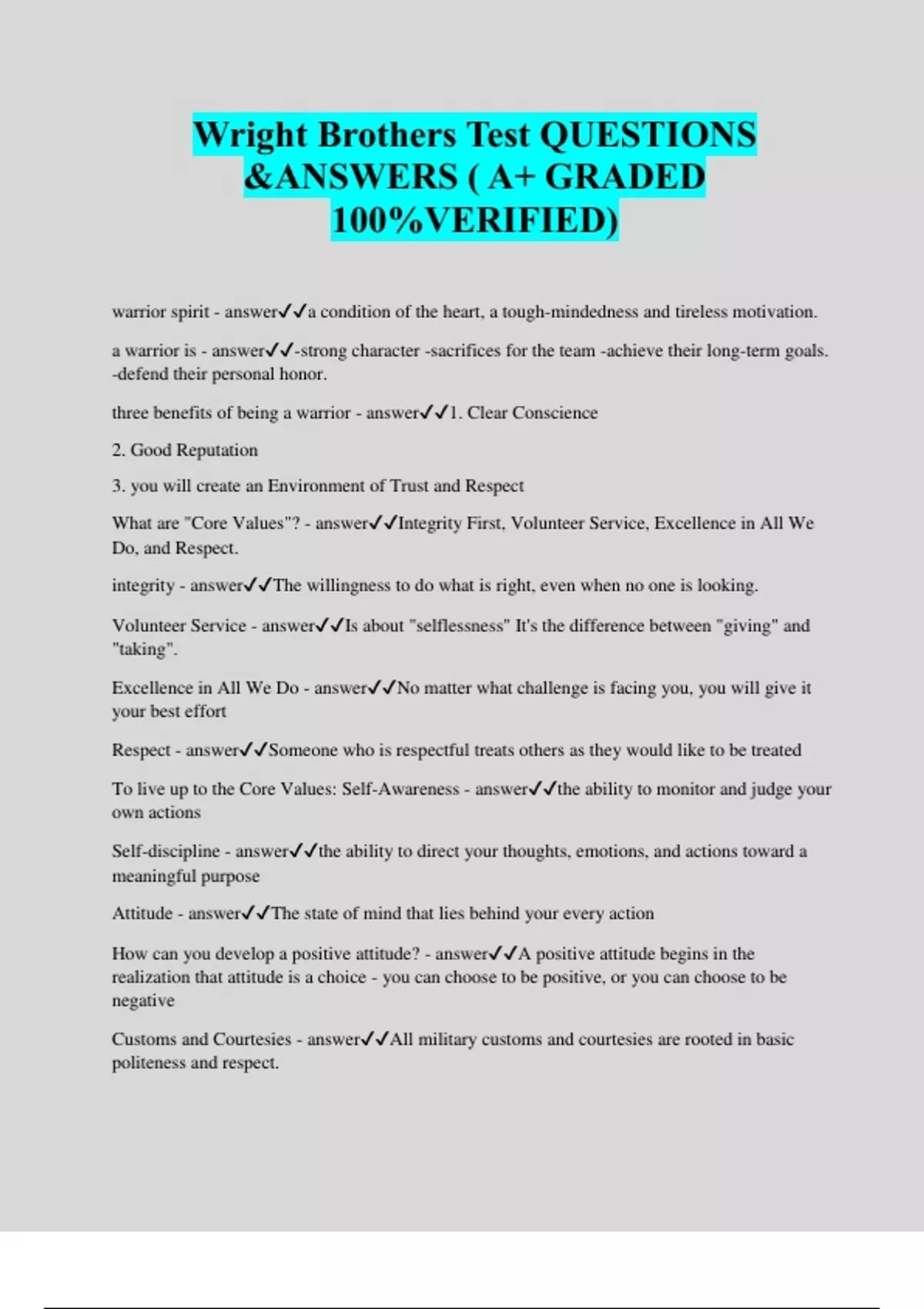 Wright Brothers Test QUESTIONS &ANSWERS ( A+ GRADED 100%VERIFIED) warrior spirit - answera condition of the heart, a tough-mindedness and tireless motivation. a warrior is - answer-strong character -sacrifices for the team -achieve their long-term goals. -defend their personal honor. three benefits of being a warrior - answer1. Clear Conscience 2. Good Reputation 3. you will create an Environment of Trust and Respect What are "Core Values"? - answerIntegrity First, Volunteer Service, Excellence in All We Do, and Respect. integrity - answerThe willingness to do what is right, even when no one is looking. Volunteer Service - answerIs about "selflessness" It's the difference between "giving" and "taking". Excellence in All We Do - answerNo matter what challenge is facing you, you will give it your best effort Respect - answerSomeone who is respectful treats others as they would like to be treated To live up to the Core Values: Self-Awareness - answerthe ability to monitor and judge your own actions Self-discipline - answerthe ability to direct your thoughts, emotions, and actions toward a meaningful purpose Attitude - answerThe state of mind that lies behind your every action How can you develop a positive attitude? - answerA positive attitude begins in the realization that attitude is a choice - you can choose to be positive, o