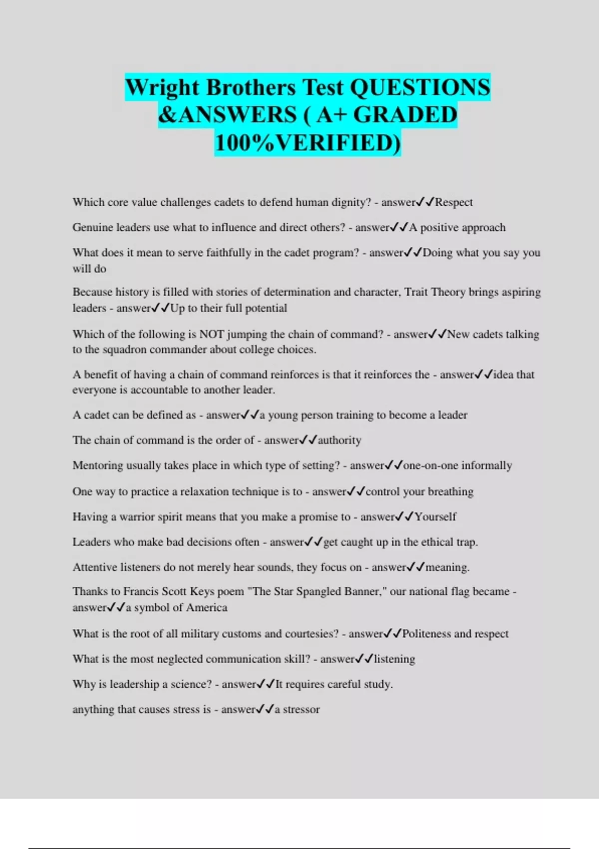 Wright Brothers Test QUESTIONS &ANSWERS ( A+ GRADED 100%VERIFIED) Which core value challenges cadets to defend human dignity? - answerRespect Genuine leaders use what to influence and direct others? - answerA positive approach What does it mean to serve faithfully in the cadet program? - answerDoing what you say you will do Because history is filled with stories of determination and character, Trait Theory brings aspiring leaders - answerUp to their full potential Which of the following is NOT jumping the chain of command? - answerNew cadets talking to the squadron commander about college choices. A benefit of having a chain of command reinforces is that it reinforces the - answeridea that everyone is accountable to another leader