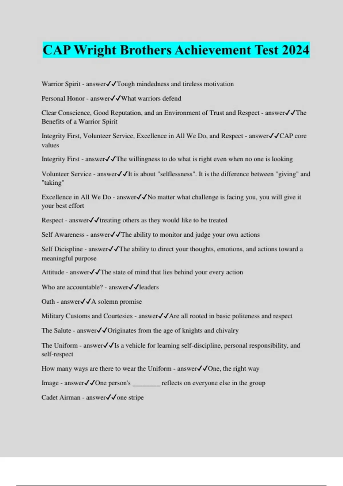 CAP Wright Brothers Achievement Test 2024 Warrior Spirit - answerTough mindedness and tireless motivation Personal Honor - answerWhat warriors defend Clear Conscience, Good Reputation, and an Environment of Trust and Respect - answerThe Benefits of a Warrior Spirit Integrity First, Volunteer Service, Excellence in All We Do, and Respect - answerCAP core values Integrity First - answerThe willingness to do what is right even when no one is looking Volunteer Service - answerIt is about "selflessness". It is the difference between "giving" and "taking" Excellence in All We Do - answerNo matter what challenge is facing you, you will give it your best effort Respect - answertreating others as they would like to be treated