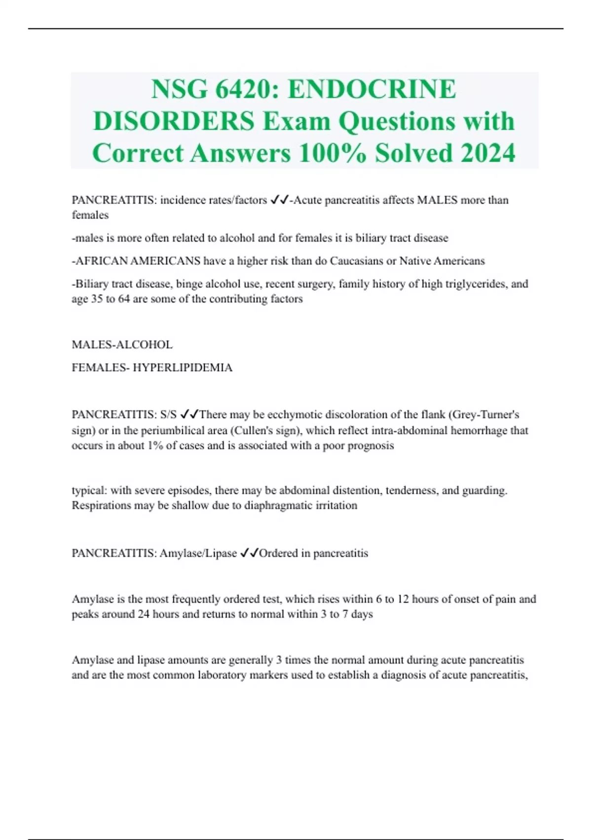 NSG 6420: ENDOCRINE DISORDERS Exam Questions with Correct Answers 100% Solved 2024 PANCREATITIS: incidence rates/factors -Acute pancreatitis affects MALES more than females -males is more often related to alcohol and for females it is biliary tract disease -AFRICAN AMERICANS have a higher risk than do Caucasians or Native Americans -Biliary tract disease, binge alcohol use, recent surgery, family history of high triglycerides, and age 35 to 64 are some of the contributing factors MALES-ALCOHOL FEMALES- HYPERLIPIDEMIA PANCREATITIS: S/S There may be ecchymotic discoloration of the flank (Grey-Turner's sign) or in the periumbilical area (Cullen's sign), which reflect intra-abdominal hemorrhage that occurs in about 1% of cases and is associated with a poor prognosis typical: with severe episodes, there may be abdominal distention, tenderness, and guarding. Respirations may be shallow due to diaphragmatic irritation PANCREATITIS: Amylase/Lipase Ordered in pancreatitis Amylase is the most frequently ordered test, which rises within 6 to 12 hours of onset of pain and peaks around 24 hours and returns to normal within 3 to 7 days Amylase and lipase amounts are generally 3 times the normal amount during acute pancreatitis and are the most common laboratory markers used to establish a diagnosis of acute pancreatitis