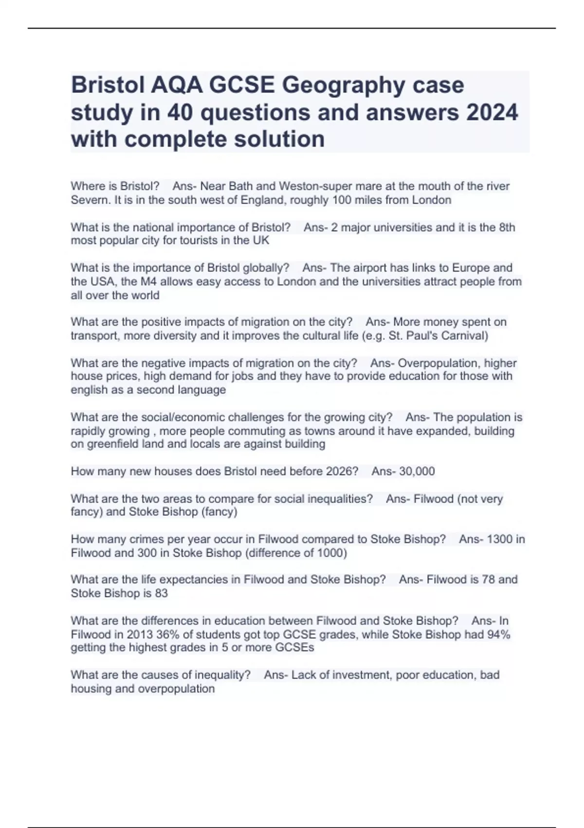 Bristol AQA GCSE Geography case study in 40 questions and answers 2024 with complete solution