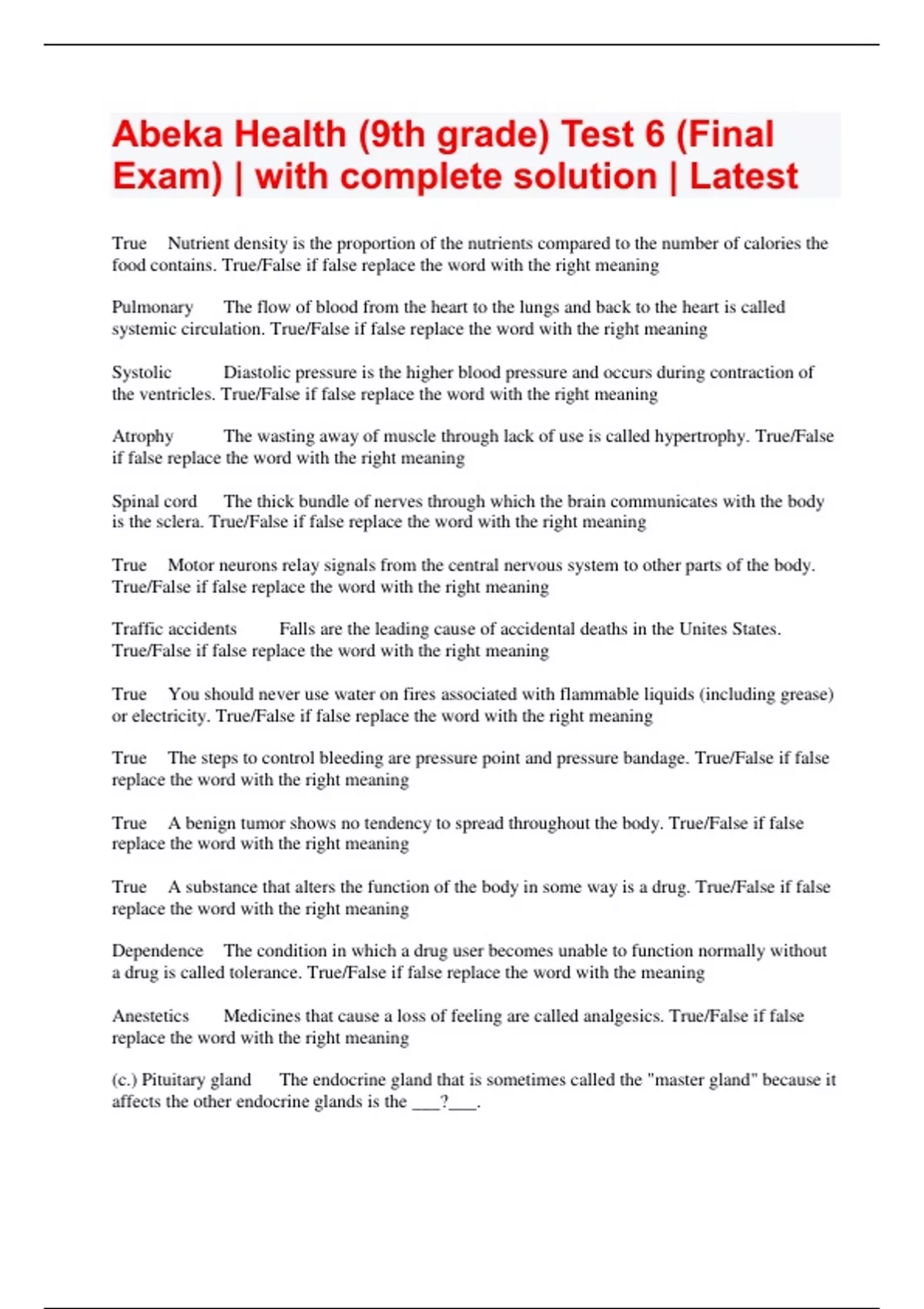 Abeka Health (9th grade) Test 6 (Final Exam) | with complete solution | Latest