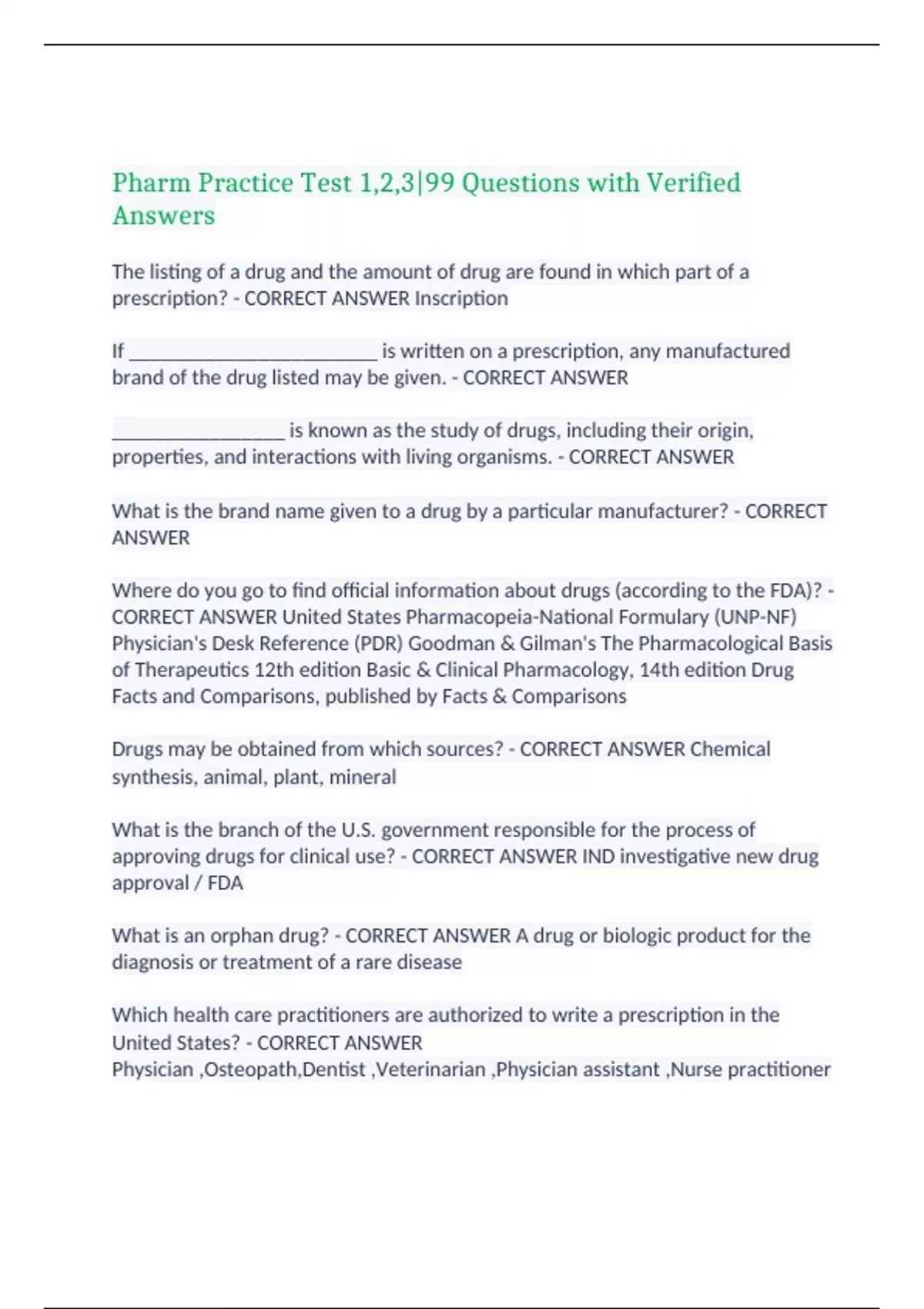 Pharm Practice Test 1,2,3|99 Questions with Verified Answers,100% CORRECT