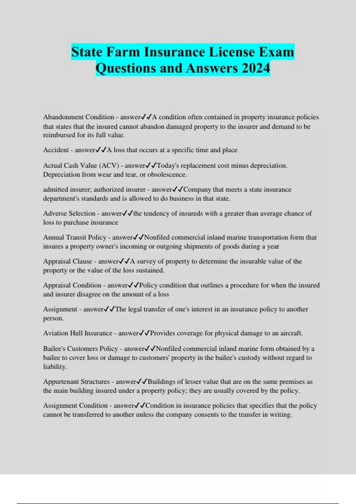 State Farm Insurance License Exam Questions and Answers 2024 Abandonment Condition - answerA condition often contained in property insurance policies that states that the insured cannot abandon damaged property to the insurer and demand to be reimbursed for its full value. Accident - answerA loss that occurs at a specific time and place Actual Cash Value (ACV) - answerToday's replacement cost minus depreciation. Depreciation from wear and tear, or obsolescence. admitted insurer; authorized insurer - answerCompany that meets a state insurance department's standards and is allowed to do business in that state. Adverse Selection - answerthe tendency of insureds with a greater than average chance of loss to purchase insurance Annual Transit Policy - answerNonfiled commercial inland marine transportation form that insures a property owner's incoming or outgoing shipments of goods during a year Appraisal Clause - answerA survey of property to determine the insurable value of the property or the value of the loss sustained. Appraisal Condition - answerPolicy condition that outlines a procedure for when the insured and insurer disagree on the amount of a loss Assignment - answerThe legal transfer of one's interest in an insurance policy to another person. Aviation Hull Insurance - answerProvides coverage for physical damage to an aircraft. Bailee's Customers Policy - answerNonfiled commercial inland marine form obtained by a bailee to cover loss or damage to customers' property in the bailee's custody without regard to liability. Appurtenant Structures - answerBuildings of lesser value that are on the same premises as the main building insured under a property policy; they are usually covered by the policy. Assignment Condition - answerCondition in insurance policies that specifies that the policy cannot be transferred to another unless the company consents to the transfer in writing