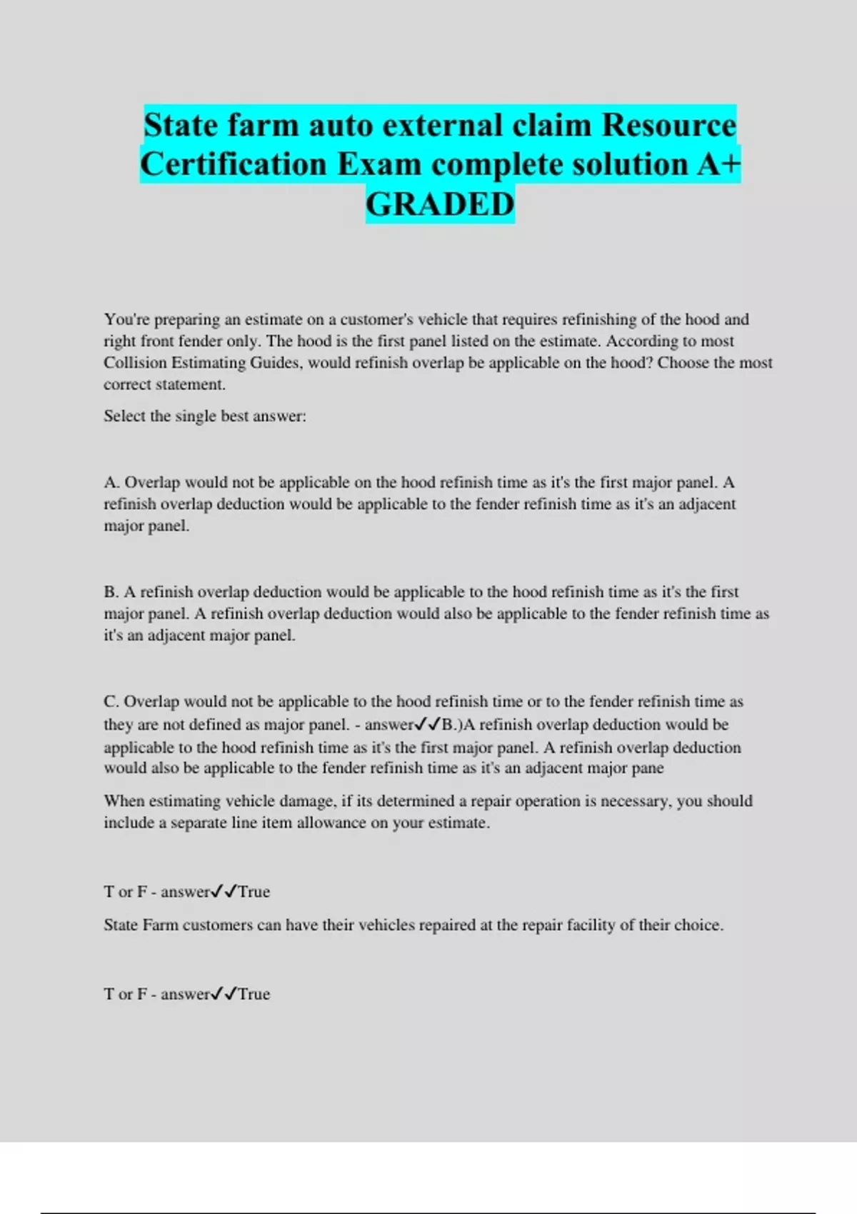State farm auto external claim Resource Certification Exam complete solution A+ GRADED You're preparing an estimate on a customer's vehicle that requires refinishing of the hood and right front fender only. The hood is the first panel listed on the estimate. According to most Collision Estimating Guides, would refinish overlap be applicable on the hood? Choose the most correct statement. Select the single best answer: A. Overlap would not be applicable on the hood refinish time as it's the first major panel. A refinish overlap deduction would be applicable to the fender refinish time as it's an adjacent major panel. B. A refinish overlap deduction would be applicable to the hood refinish time as it's the first major panel. A refinish overlap deduction would also be applicable to the fender refinish time as it's an adjacent major panel. C. Overlap would not be applicable to the hood refinish time or to the fender refinish time as they are not defined as major panel. - answerB.)A refinish overlap deduction would be applicable to the hood refinish time as it's the first major panel. A refinish overlap deduction would also be applicable to the fender refinish time as it's an adjacent major pane When estimating vehicle damage, if its determined a repair operation is necessary, you should include a separate line item allowance on your estimate. T or F - answerTrue State Farm customers can have their vehicles repaired at the repair facility of their choice. T or F - answerTrue