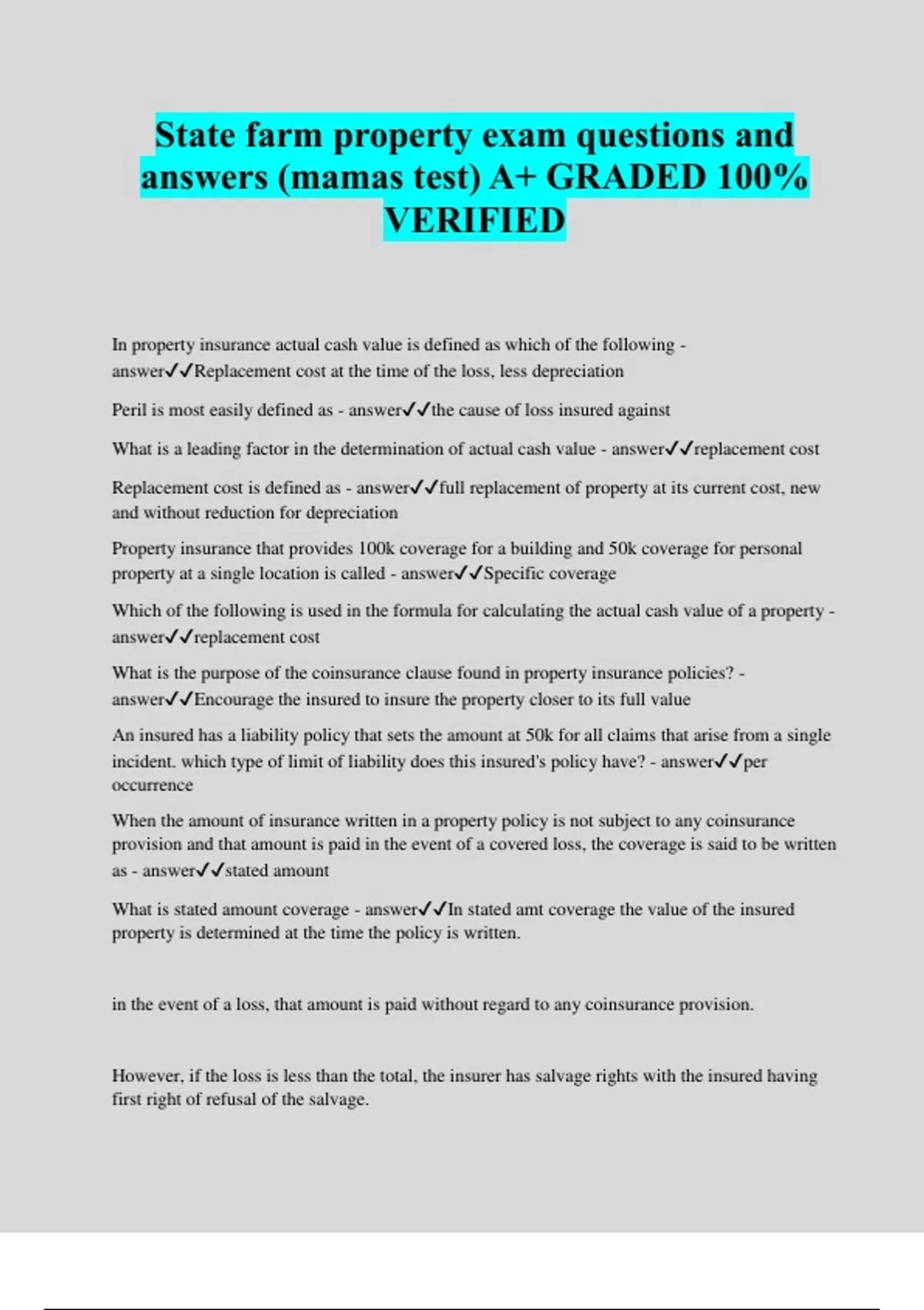 State farm property exam questions and answers (mamas test) A+ GRADED 100% VERIFIED In property insurance actual cash value is defined as which of the following - answerReplacement cost at the time of the loss, less depreciation Peril is most easily defined as - answerthe cause of loss insured against What is a leading factor in the determination of actual cash value - answerreplacement cost Replacement cost is defined as - answerfull replacement of property at its current cost, new and without reduction for depreciation Property insurance that provides 100k coverage for a building and 50k coverage for personal property at a single location is called - answerSpecific coverage Which of the following is used in the formula for calculating the actual cash value of a property - answerreplacement cost What is the purpose of the coinsurance clause found in property insurance policies? - answerEncourage the insured to insure the property closer to its full value An insured has a liability policy that sets the amount at 50k for all claims that arise from a single incident. which type of limit of liability does this insured's policy have? - answerper occurrence When the amount of insurance written in a property policy is not subject to any coinsurance provision and that amount is paid in the event of a covered loss, the coverage is said to be written as - answerstated amount What is stated amount coverage - answerIn stated amt coverage the value of the insured property is determined at the time the policy is written. in the event of a loss, that amount is paid without regard to any coinsurance provision. However, if the loss is less than the total, the insurer has salvage rights with the insured having first right of refusal of the salvage.