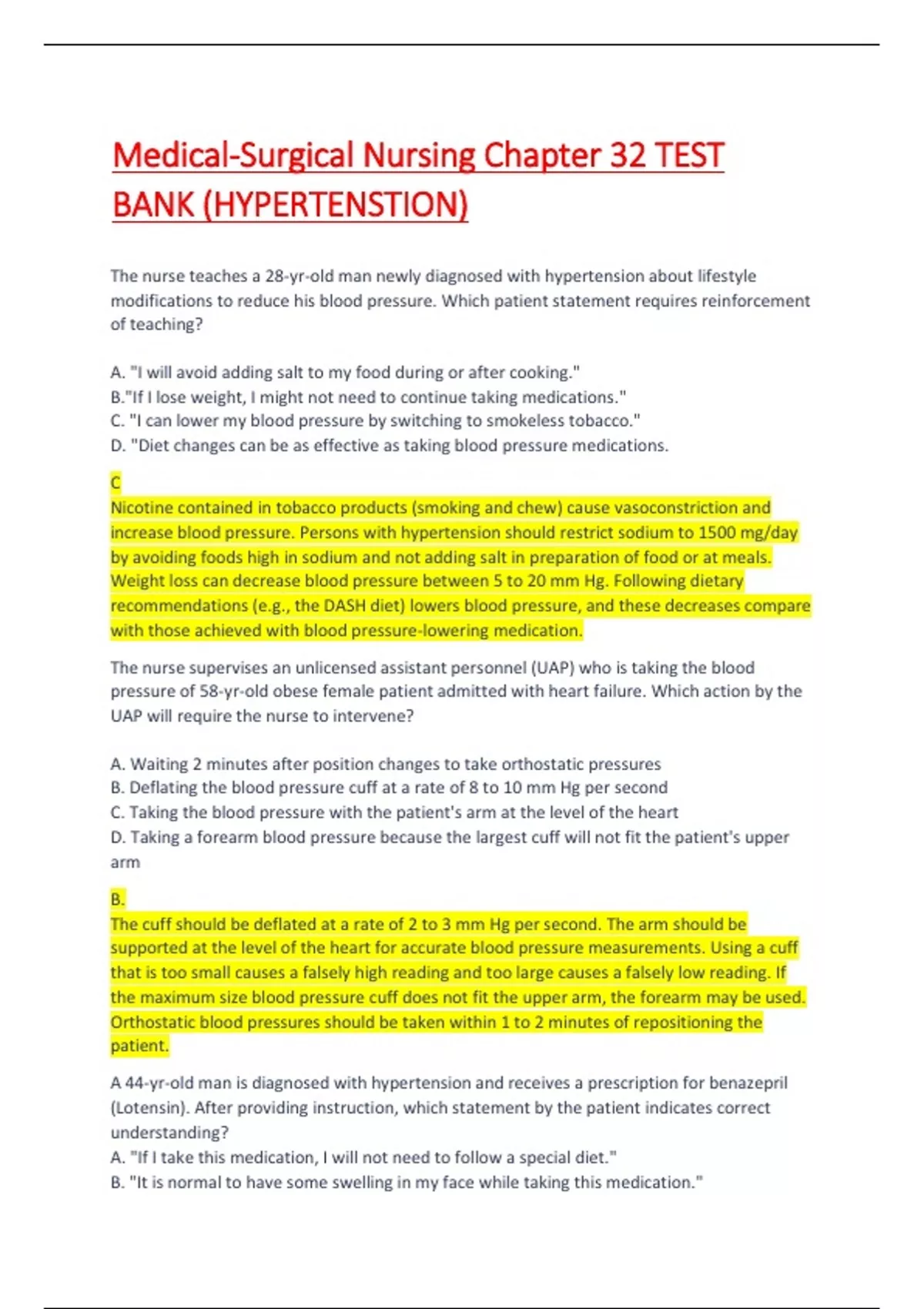 C Nicotine contained in tobacco products (smoking and chew) cause vasoconstriction and increase blood pressure. Persons with hypertension should restrict sodium to 1500 mg/day by avoiding foods high in sodium and not adding salt in preparation of food or at meals. Weight loss can decrease blood pressure between 5 to 20 mm Hg. Following dietary recommendations (e.g., the DASH diet) lowers blood pressure, and these decreases compare with those achieved with blood pressure-lowering medication. The nurse supervises an unlicensed assistant personnel (UAP) who is taking the blood pressure of 58-yr-old obese female patient admitted with heart failure. Which action by the UAP will require the nurse to intervene? A. Waiting 2 minutes after position changes to take orthostatic pressures B. Deflating the blood pressure cuff at a rate of 8 to 10 mm Hg per second C. Taking the blood pressure with the patient's arm at the level of the heart D. Taking a forearm blood pressure because the largest cuff will not fit the patient's upper arm B. The cuff should be deflated at a rate of 2 to 3 mm Hg per second. The arm should be supported at the level of the heart for accurate blood pressure measurements. Using a cuff that is too small causes a falsely high reading and too large causes a falsely low reading. If the maximum size blood pressure cuff does not fit the upper arm, the forearm may be used. Orthostatic blood pressures should be taken within 1 to 2 minutes of repositioning the patient. A 44-yr-old man is diagnosed with hypertension and receives a prescription for benazepril (Lotensin). After providing instruction, which statement by the patient indicates correct understanding? A. "If I take this medication, I will not need to follow a special diet." B. "It is normal to have some swelling in my face while taking this medication."