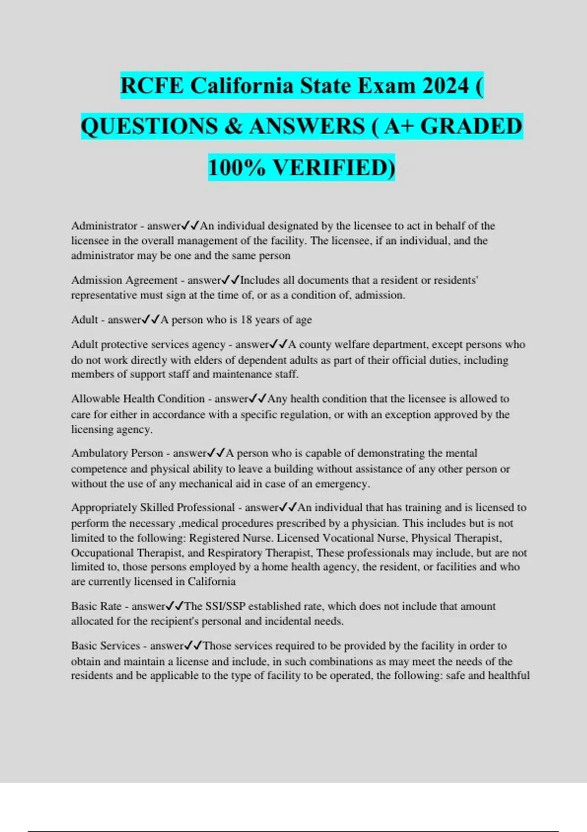 RCFE California State Exam 2024 ( QUESTIONS & ANSWERS ( A+ GRADED 100% VERIFIED) Administrator - answerAn individual designated by the licensee to act in behalf of the licensee in the overall management of the facility. The licensee, if an individual, and the administrator may be one and the same person Admission Agreement - answerIncludes all documents that a resident or residents' representative must sign at the time of, or as a condition of, admission. Adult - answerA person who is 18 years of age Adult protective services agency - answerA county welfare department, except persons who do not work directly with elders of dependent adults as part of their official duties, including members of support staff and maintenance staff. Allowable Health Condition - answerAny health condition that the licensee is allowed to care for either in accordance with a specific regulation, or with an exception approved by the licensing agency. Ambulatory Person - answerA person who is capable of demonstrating the mental competence and physical ability to leave a building without assistance of any other person or without the use of any mechanical aid in case of an emergency. Appropriately Skilled Professional - answerAn individual that has training and is licensed to perform the necessary ,medical procedures prescribed by a physician. This includes but is not limited to the following: Registered Nurse. Licensed Vocational Nurse, Physical Therapist, Occupational Therapist, and Respiratory Therapist, These professionals may include, but are not limited to, those persons employed by a home health agency, the resident, or facilities and who are currently licensed in California