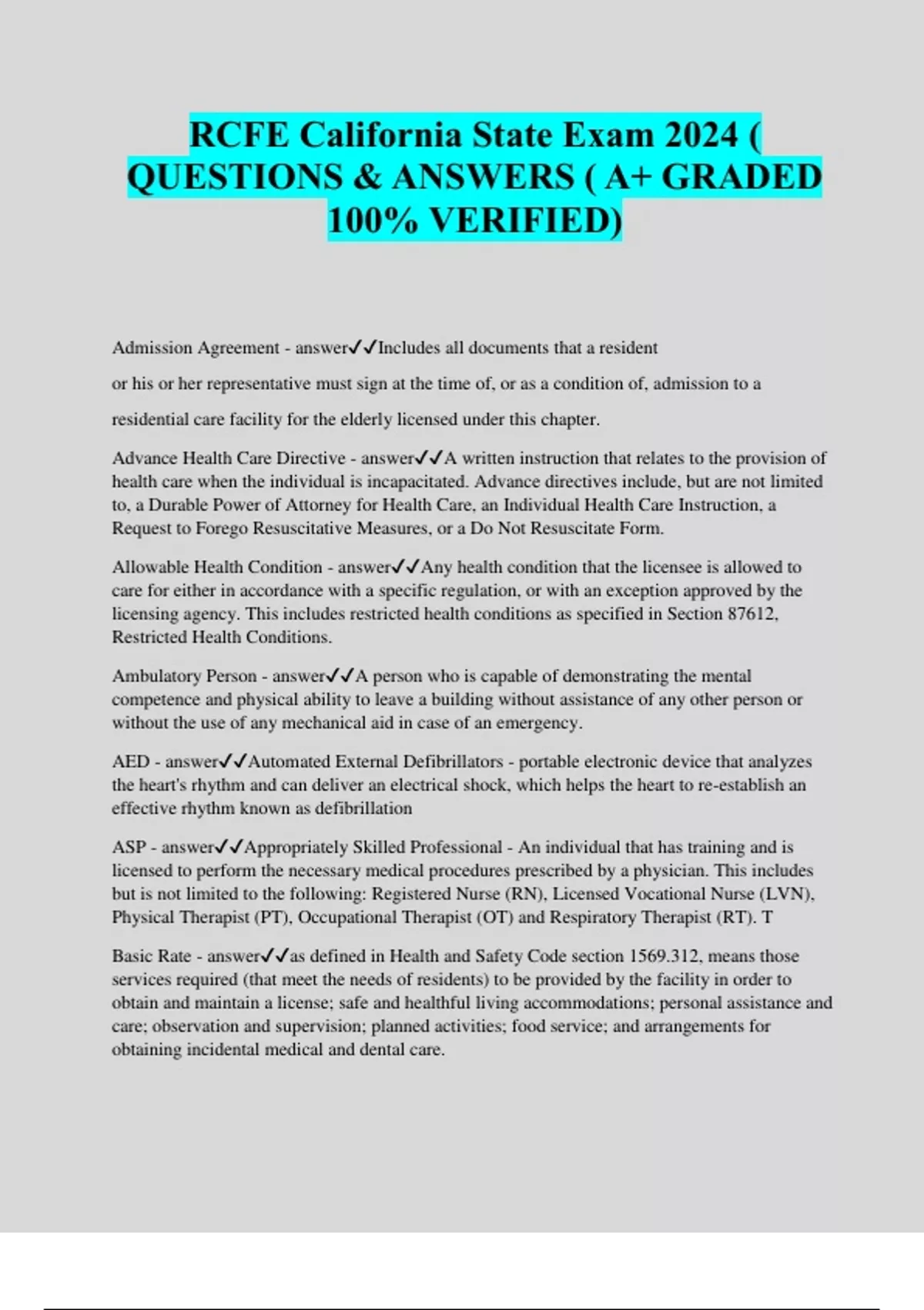 RCFE California State Exam 2024 ( QUESTIONS & ANSWERS ( A+ GRADED 100% VERIFIED) Admission Agreement - answerIncludes all documents that a resident or his or her representative must sign at the time of, or as a condition of, admission to a residential care facility for the elderly licensed under this chapter. Advance Health Care Directive - answerA written instruction that relates to the provision of health care when the individual is incapacitated. Advance directives include, but are not limited to, a Durable Power of Attorney for Health Care, an Individual Health Care Instruction, a Request to Forego Resuscitative Measures, or a Do Not Resuscitate Form. Allowable Health Condition - answerAny health condition that the licensee is allowed to care for either in accordance with a specific regulation, or with an exception approved by the licensing agency. This includes restricted health conditions as specified in Section 87612, Restricted Health Conditions. Ambulatory Person - answerA person who is capable of demonstrating the mental competence and physical ability to leave a building without assistance of any other person or without the use of any mechanical aid in case of an emergency. AED - answerAutomated External Defibrillators - portable electronic device that analyzes the heart's rhythm and can deliver an electrical shock, which helps the heart to re-establish an effective rhythm known as defibrillation ASP - answerAppropriately Skilled Professional - An individual that has training and is licensed to perform the necessary medical procedures prescribed by a physician. This includes but is not limited to the following: Registered Nurse (RN), Licensed Vocational Nurse (LVN), Physical Therapist (PT), Occupational Therapist (OT) and Respiratory Therapist (RT). T Basic Rate - answeras defined in Health and Safety Code section 1569.312, means those services required (that meet the needs of residents) to be provided by the facility in order to obtain and maintain a license; safe and healthful living accommodations; personal assistance and care; observation and supervision; planned activities; food service; and arrangements for obtaining incidental medical and dental care